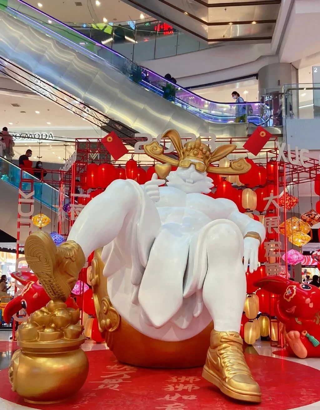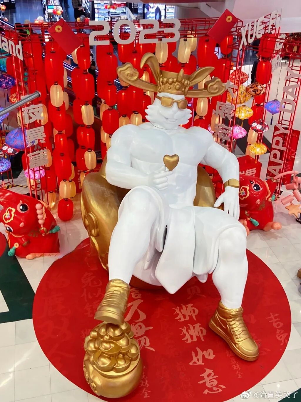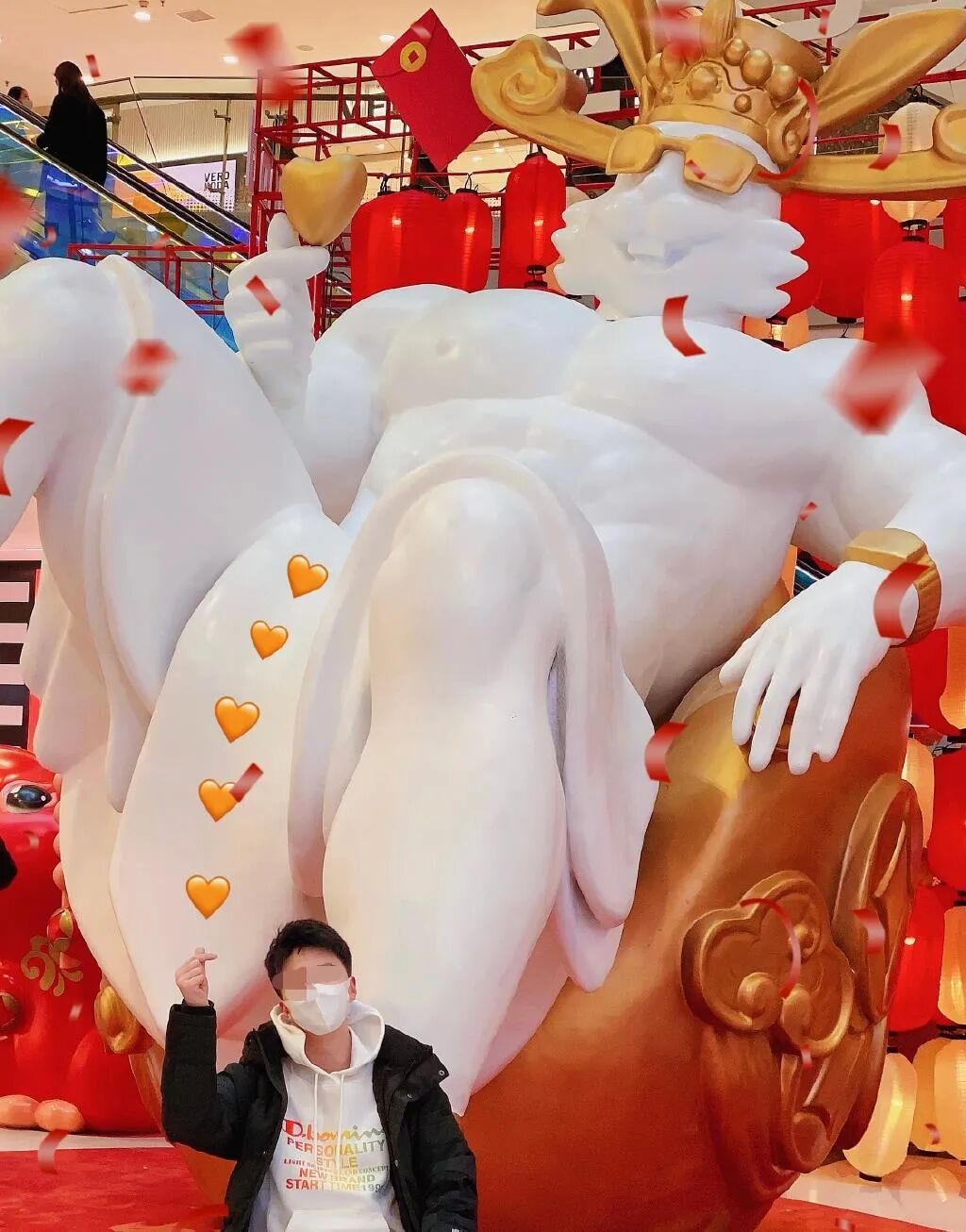 春节期间,有网友晒出了哈尔滨一商场内的吉祥物,只见它全身纯白,浑身腱子肉,头戴财神帽、眼戴墨镜、右手比心、左手金表、脚踩一堆金元宝,两腿撒开坐在一个大金元宝沙发上,而敏感部位还特意用一块布遮住。