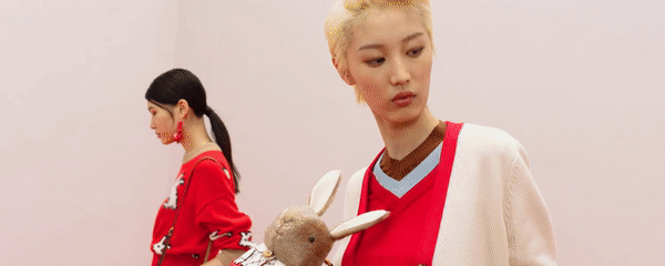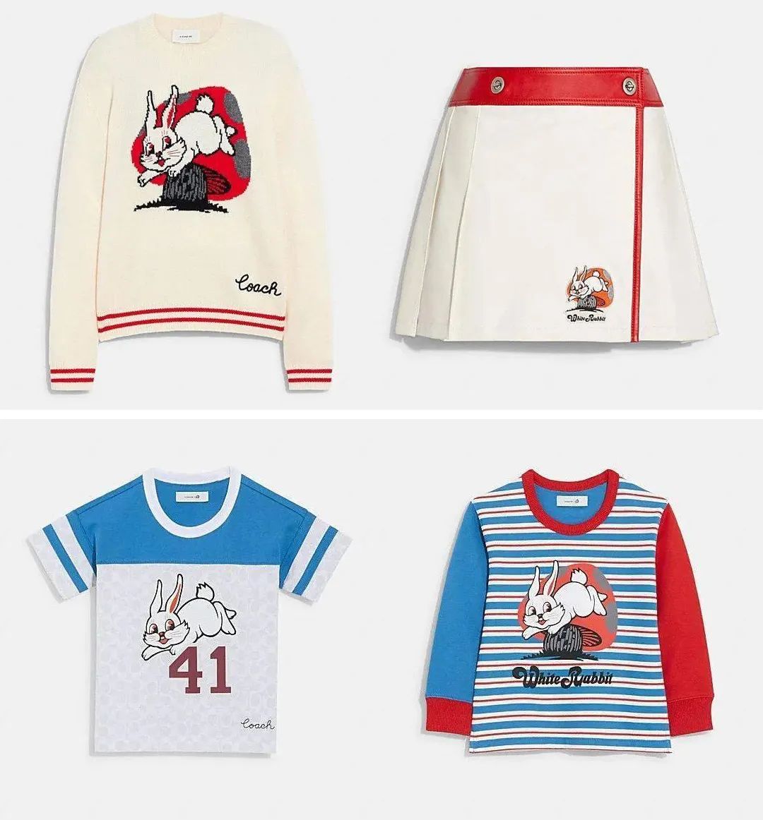 这个联名合作款以年轻一代的视角重塑经典,以大白兔奶糖经典的红、黑、白为主调,融入到了针织毛衣、连衣裙、夹克外套、牛仔短裙、手袋、配饰等单品中,不仅轻松搭上了新春兔年的便车,更借助大白兔自带的童年滤镜,可谓是一箭双雕。