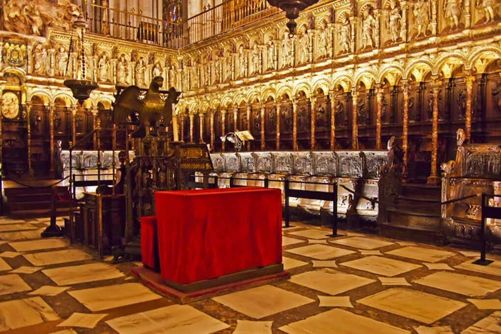 下排座椅54组,上方的雕刻从十五世纪开始雕刻,表现了1492年光复战争中西班牙天主教君主击败阿拉伯人、收复格拉纳达的历史场面,再现了占领广场和堡垒甚至攻占格拉纳达的场景,皆用凸雕表现,具有很高的历史和艺术价值。