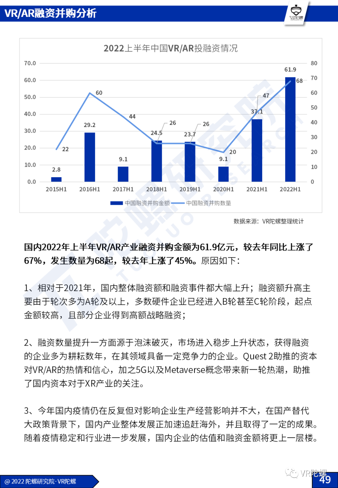 国内互联网巨头今年布局VR/AR速度明显加快,以去年字节高额收购Pico事件作为导火索,今年将有更多新企业加 入VR赛道;另一方面,AR热度不减,从2019年至今始终保持高速增长,不论是从融资热度、企业数量还是产品数量 上,都远高于VR。据VR陀螺整理统计,2022年上半年全球VR/AR行业整体投融资总额为312.6亿元,去年同期为228.2亿元,同比上升了37%。从融资并购事件数量来看,2022年全球VR/AR发生172起融资并购案例,较2021年同比增长16%,整个VR/AR行业发展态势良好。