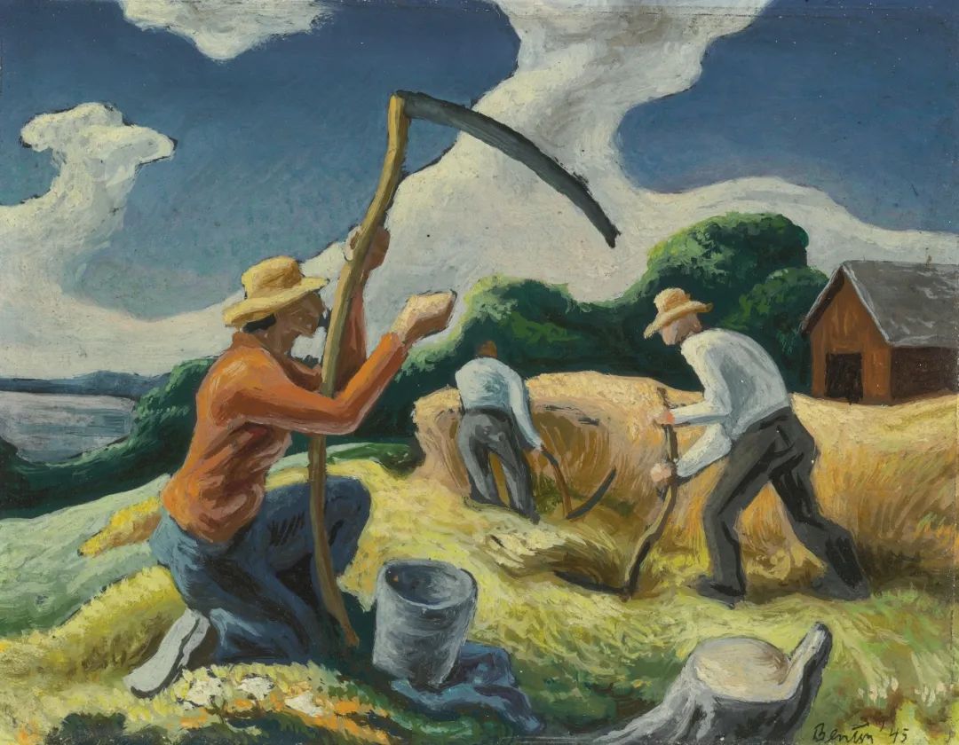 在此期间,本顿还完成了油画作品,包括两幅中西部背景的古典裸体画--《苏珊娜和长者》(1938年,旧金山美术博物馆)和《珀耳塞福涅》(1938-1939年,密苏里州堪萨斯城尼尔森-阿特金斯艺术博物馆),以及更传统的地区主义主题,如《七月干草》(1943年,大都会艺术博物馆)。