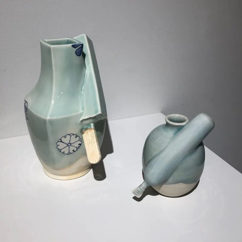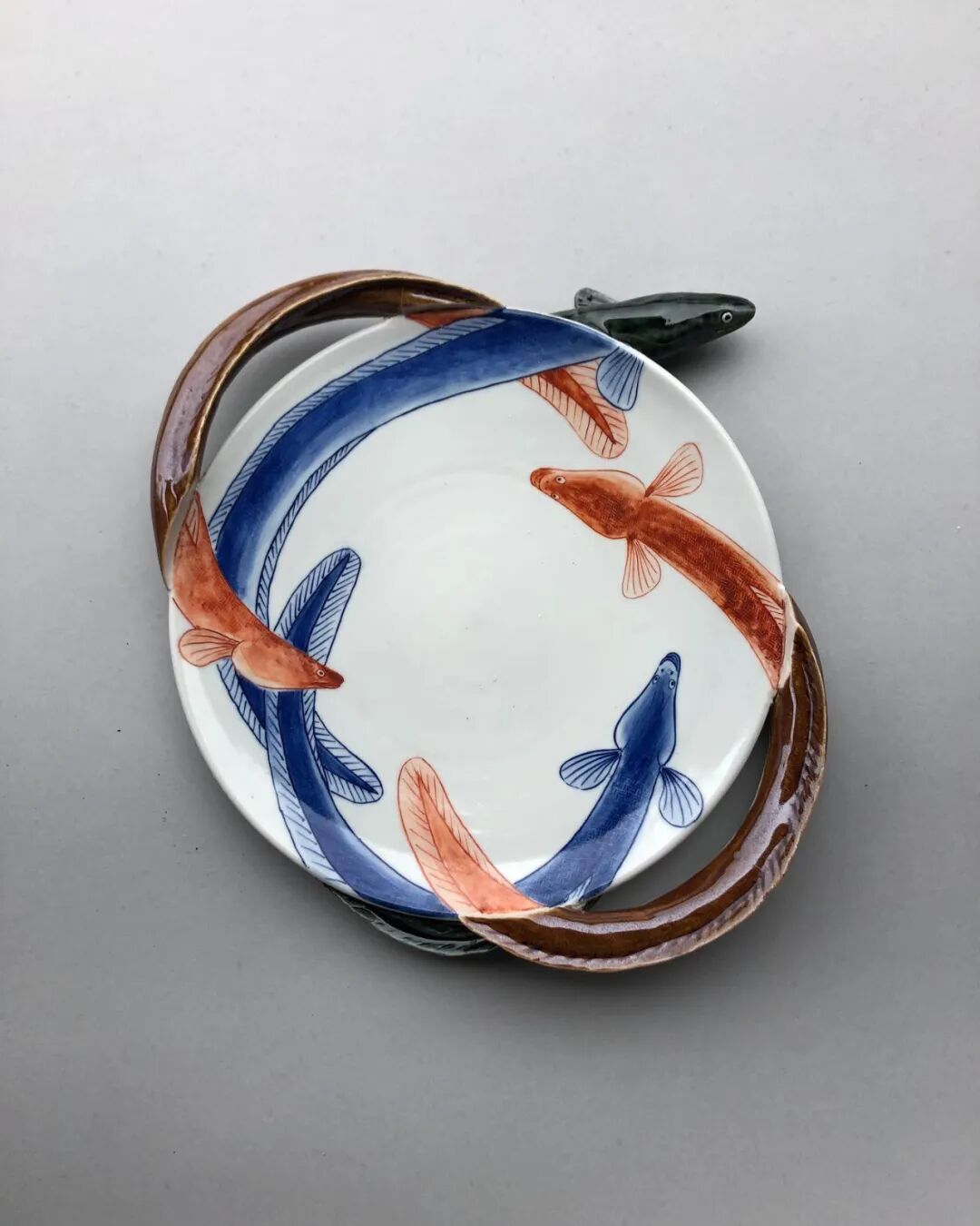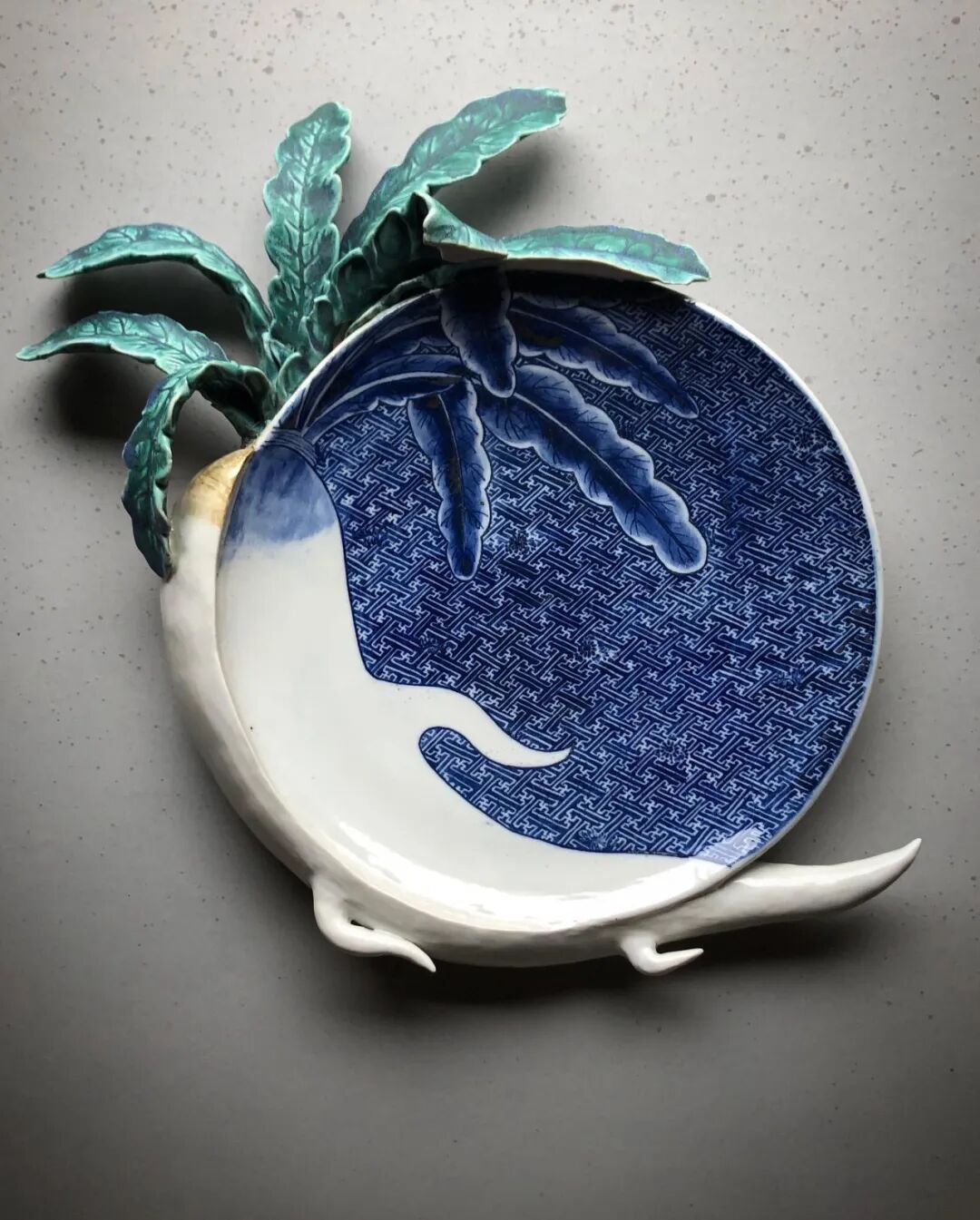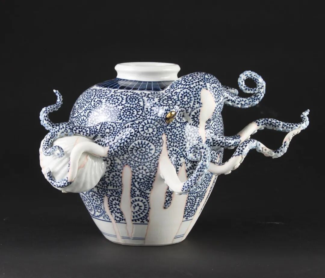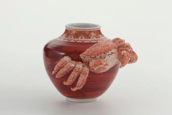 原本完整的陶瓷制品,突然添加上一个立体的事物,这种经过碰撞产生带有矛盾的作品,给人一种超现实的视觉效果,也自然受到许多人的喜爱。