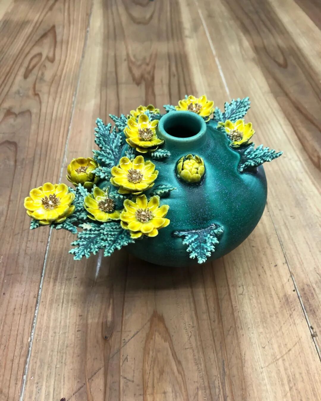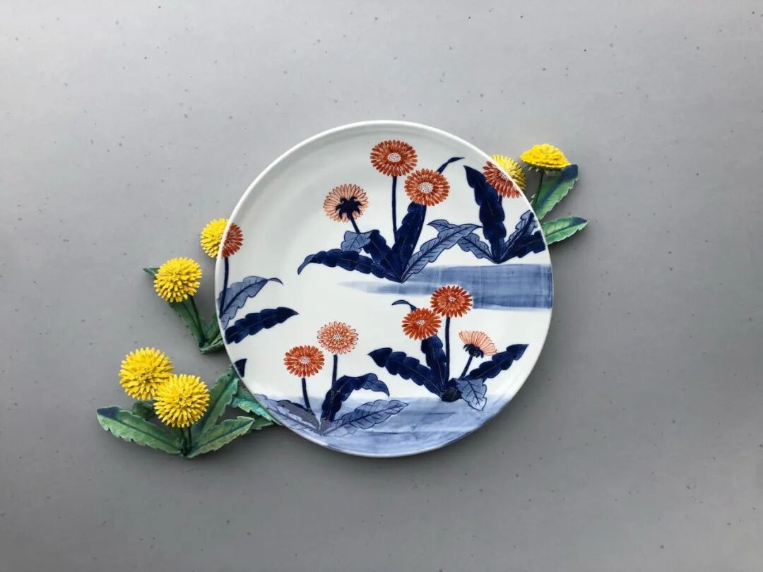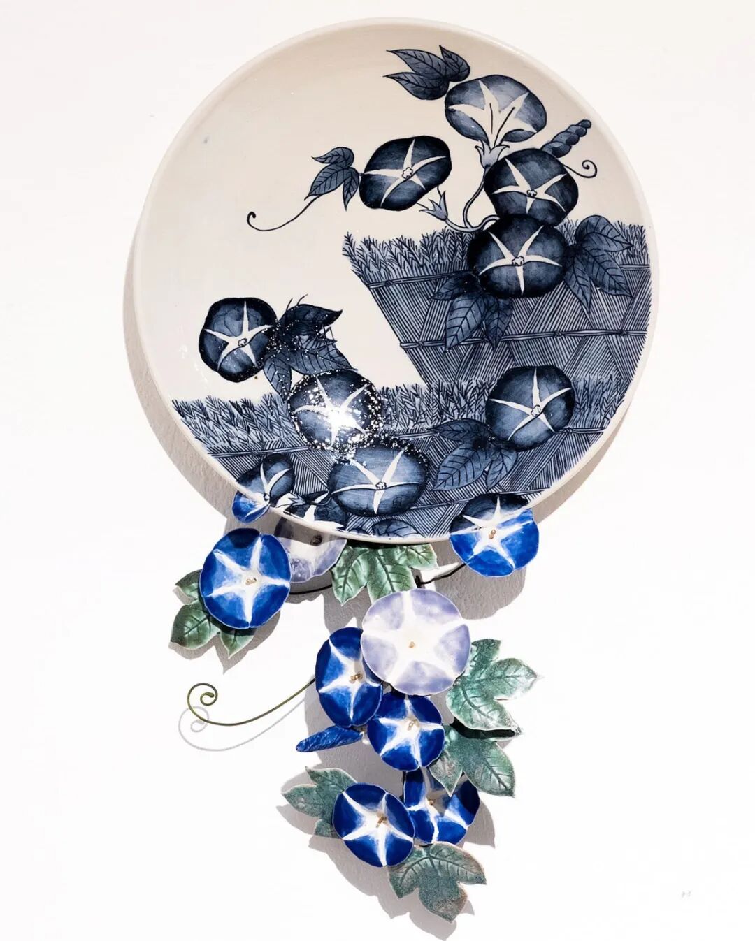真本惠子的陶瓷作品,主体是较为普通且常见的传统餐盘、花瓶和陶罐,在这些传统陶瓷的基础上,她又做了一些改变,这些改变并不是随便添加,而是她根据陶瓷制品上的花纹进行延伸创作,例如,在花瓶上描绘有桃花的图案,那么在这位艺术家的作品中,桃花好似从图案中生长出来,变成了一个立体的雕塑,这就是为什么说她的作品跨越了“维度”。为这些传统的陶瓷制品,赋予全新的形象,使它们变成一个个符合当代人审美的创意作品,也自然连接了传统与现代文化。