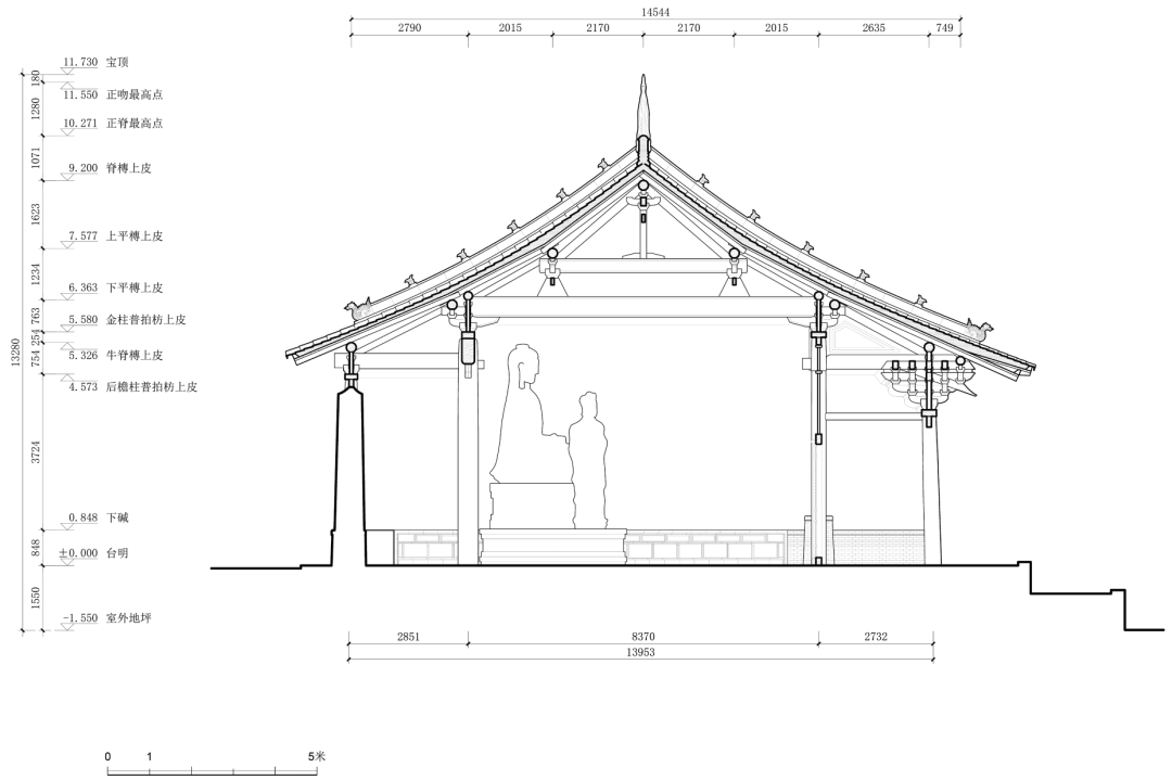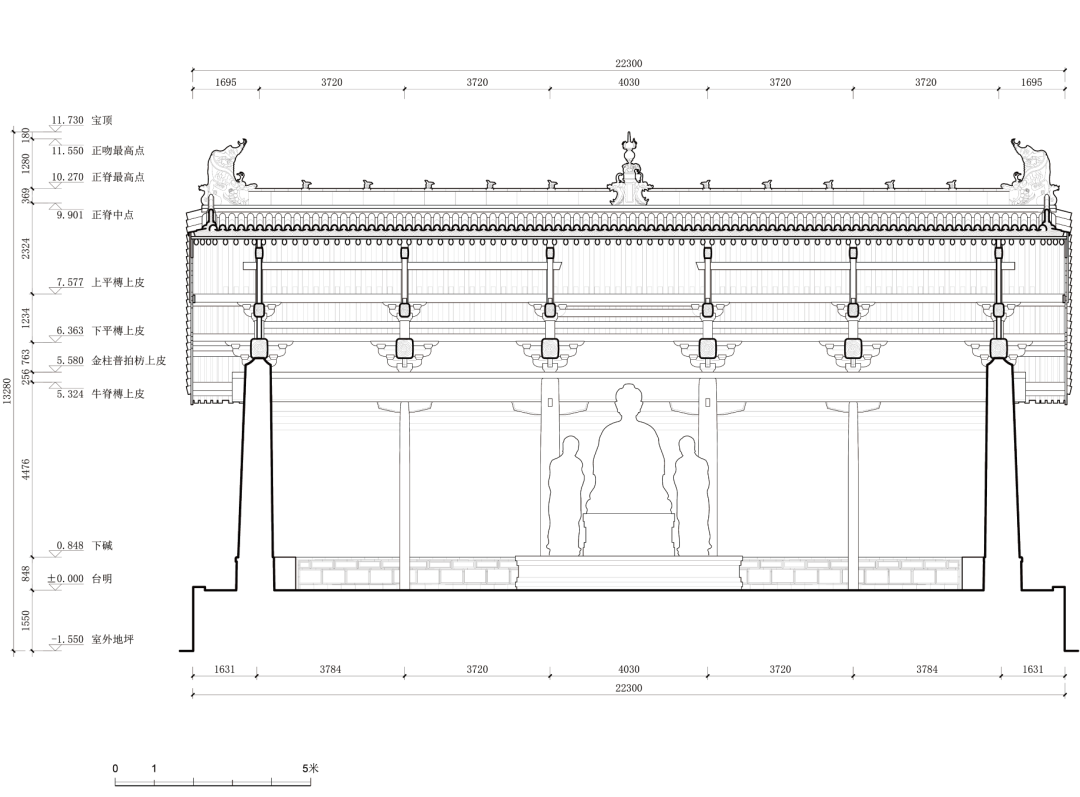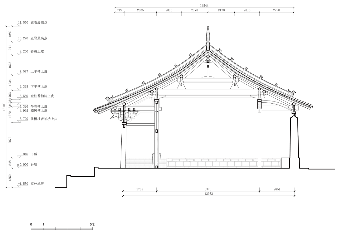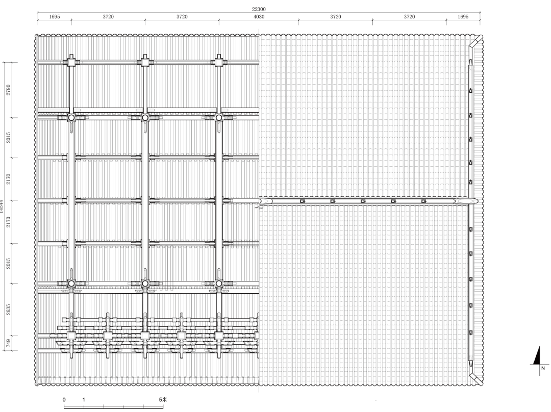 2021 年6 月底,清华大学建筑学院于山西柳林香严寺展开了为期一周的测绘课程。本次测绘由刘畅担任指导教师,赵寿堂、迟雅元、侯欣江担任助教,测绘方式以手工测量和摄影测量为主。潘恒言、何谐、兰煐棋、朱珍妮等23 名本科生分为四组,完成了山门、大雄殿、慈氏殿、毗卢殿四座建筑的测绘工作。其中,大雄殿测图由何谐、闭楚苗、袁子凌、陈筱儒、芶静怡、徐世祺、侯悦欣绘制,赵寿堂整理完成。