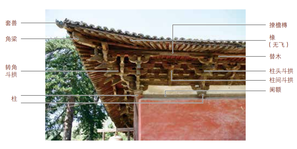 斗拱的计量单位以组而论,宋代称为一朵,清代称为一攒。依位置不同,可分为柱头斗拱(宋称柱头铺作、清称柱头科)、柱间斗拱(宋称补间铺作、清称平身科),以及转角斗拱(宋称转角铺作、清称角科)。早期建筑仅有转角斗拱与柱头斗拱,普遍雄大健硕,有力地承担了深远的檐部,如图佛光寺前檐悬挑伸出达四米之多。柱间斗拱出现于中唐之后,图中可见造型纤细、尚处在发展中的柱间斗拱。