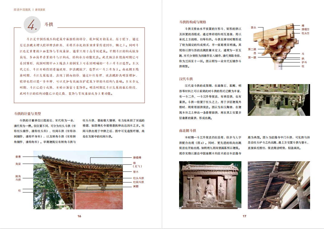 比如中国传统木构建筑中最独特的斗拱这一部分,先描述它的造型、作用和其它附加功能如装饰和象征,再按时间顺序简要介绍斗拱的发展历程,让读者一下子就能抓到重点。