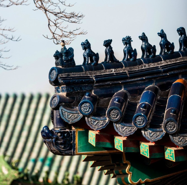 明清高等级建筑戗脊的末端,依等级会安置不同数量的脊兽,一般以骑鸡仙人居首,龙形戗兽收尾,中间脊兽自三尊起,取单数,最多为九尊。