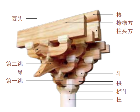 斗拱主要由水平放置的方形斗、矩形的拱以及斜置的昂组成,通过榫卯结构相互连接,用以承托上方的槫、枋等构件。斗拱至唐宋时期形成了较为固定的构成模式,并一直延续至明清。其规格以拱与昂的出跳数量来定义,通常为一至五跳,宋代分别称为四铺作至八铺作,清代则取奇数,称为三踩至十一踩。