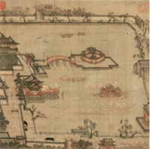 东京城外的金明池是北宋时期重要的观景游艺场所。金明池原为训练水军之处,承平日久,变成了举办龙舟赛事的场所。传为张择端所作的《金明池争标图》就生动地描绘了在池内举行龙舟竞渡活动的盛况。