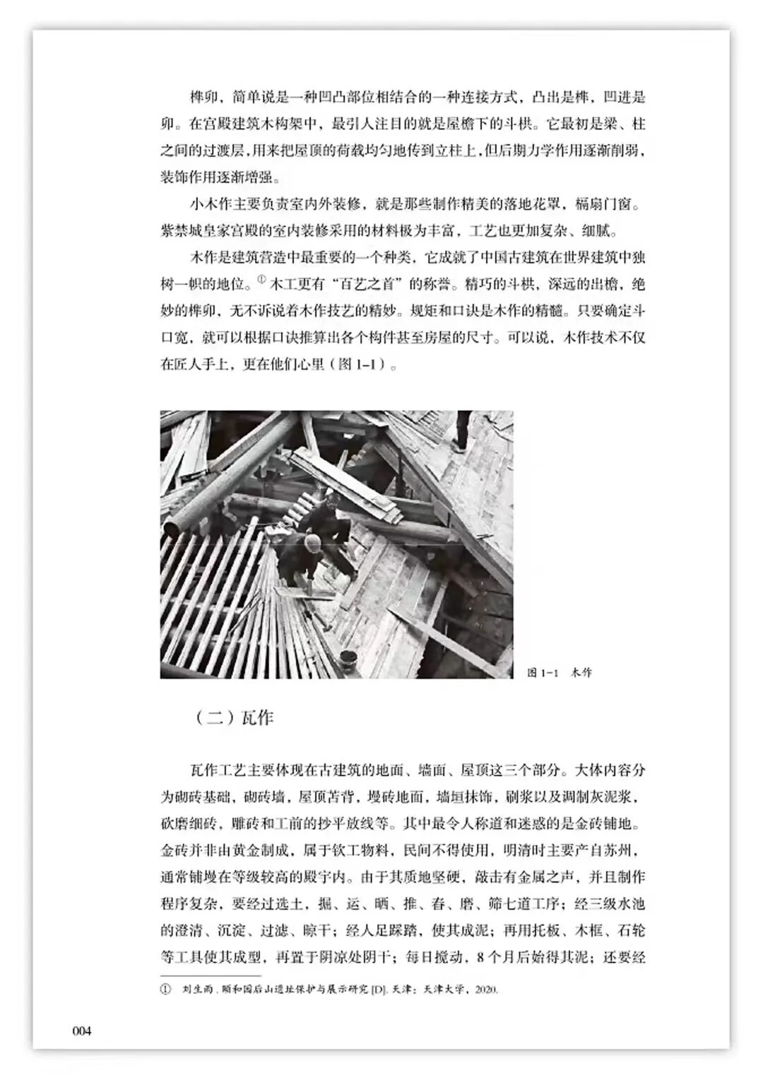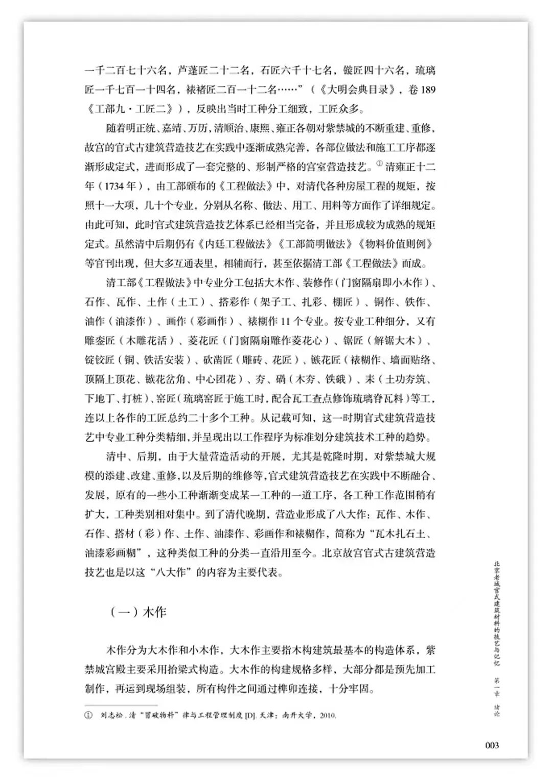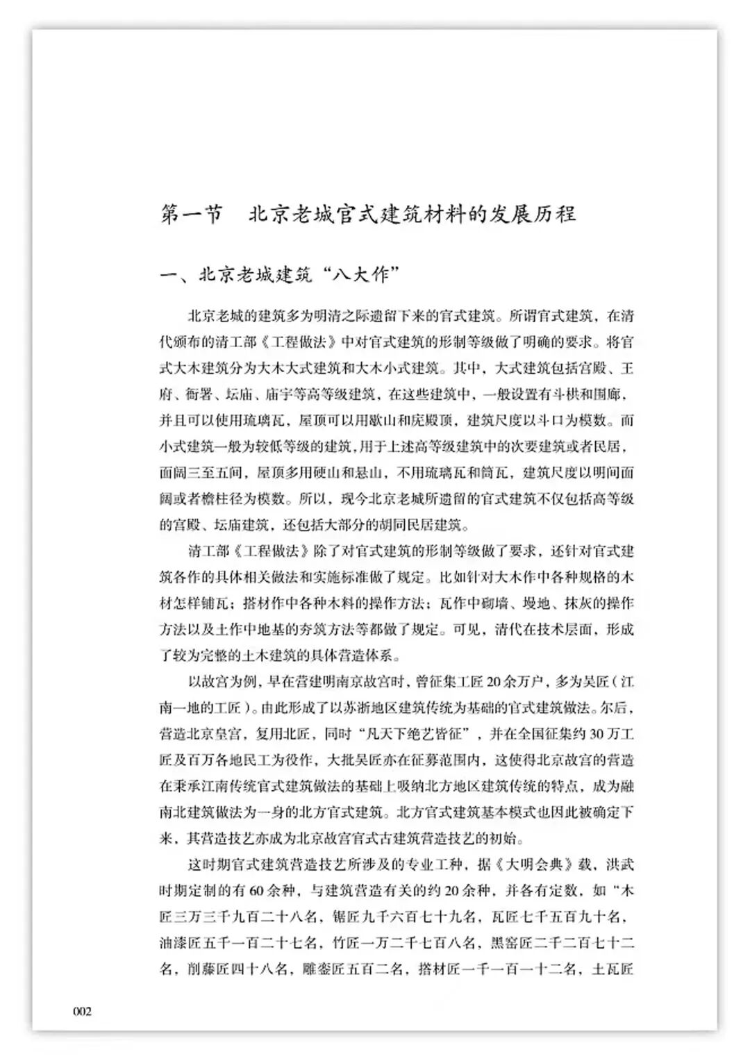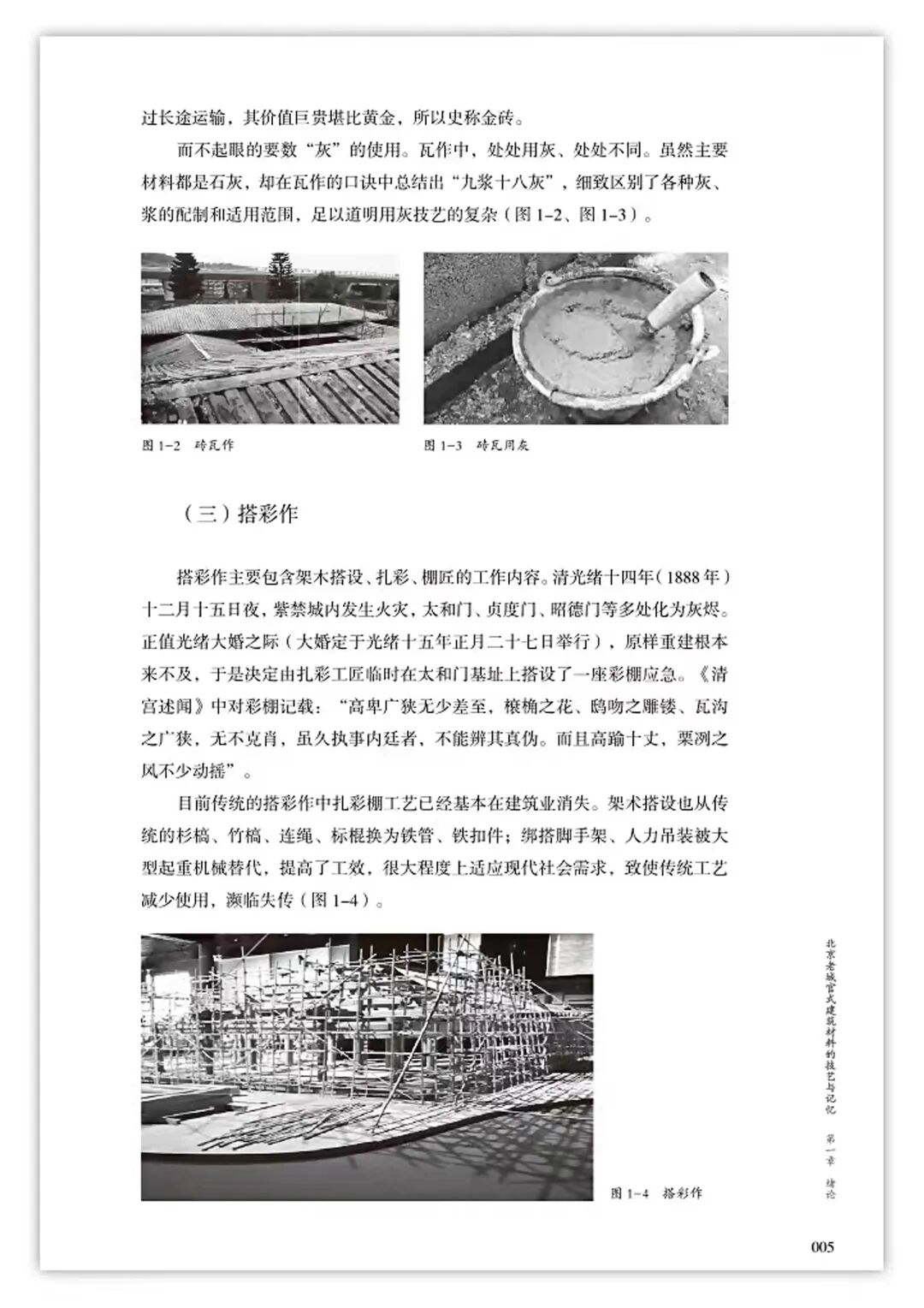 《北京老城官式建筑材料的技艺与记忆》也是一部着力于抢救和挖掘古建筑材料遗产的专著,作者通过对传统建筑材料生产厂家的调研、古建专家的走访,梳理了北京旧城官式建筑材料的发展历史和现状,并结合官式古建八大作传统技艺对木、石、砖瓦、琉璃、灰浆、油漆等传统材料的加工工艺进行了细致的分析,对北京地区传统建筑材料生产加工技艺的传承保护和产业的可持续发展提出了对策性的建议。总之,该书是一部在田野调研基础上,对传统建筑材料进行针对性研究的学术性、实践性著作,相信它的出版会对北京古建筑研究及传统营造技艺传承保护起到积极的作用。