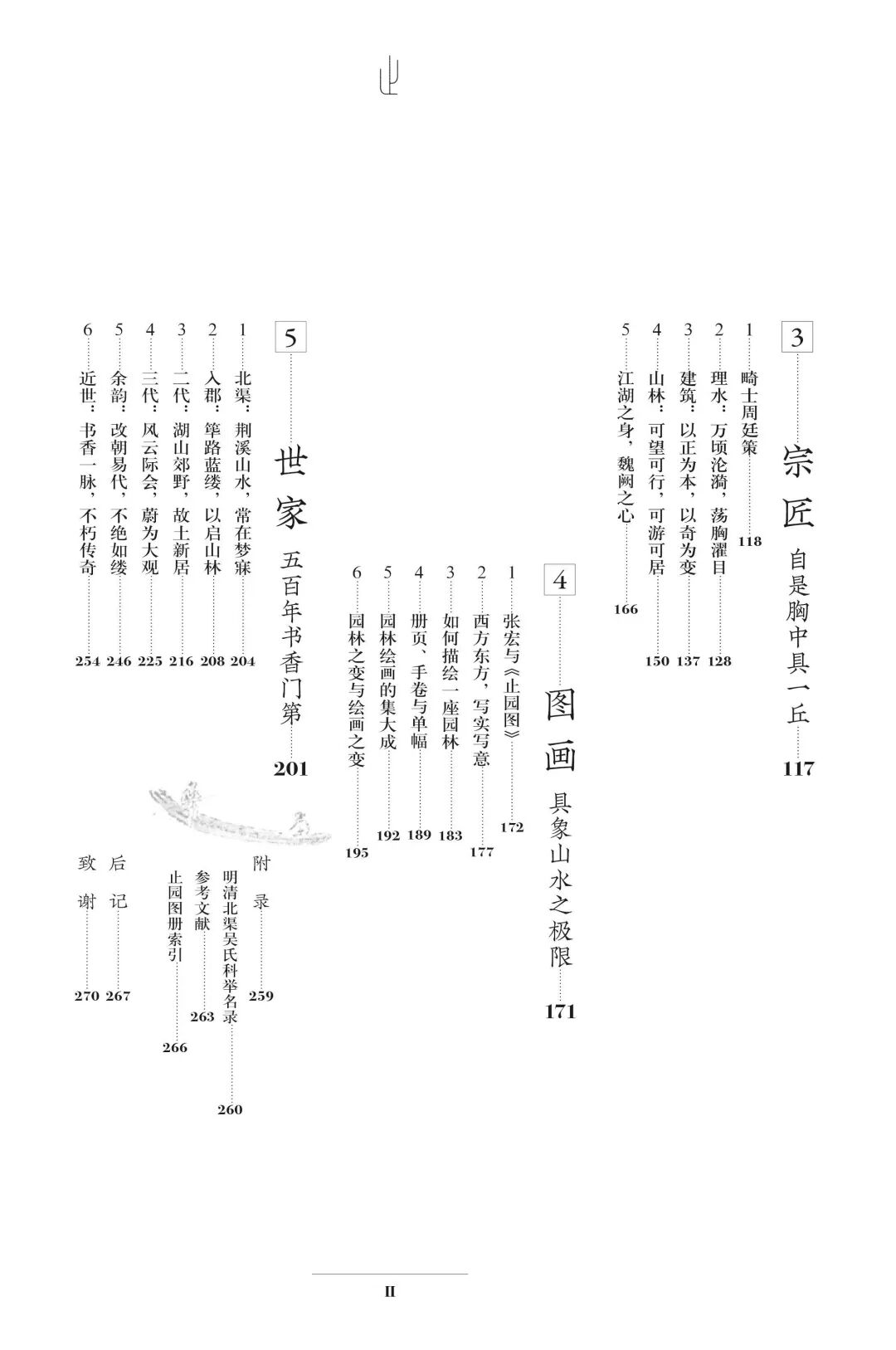 全书分五章,第一章“追寻:跨越时空的对话”介绍了高居翰等学者对《止园图》册页和止园的发现过程和研究;第二章“名园:咫尺桃源可问津”以《止园集》里的诗和止园画为线索进行图文互证,对止园进行了复原,对园主之于止园的经营和寄托进行了挖掘,展现了其现实人生的生存境界和诗画人生的理想境界,对诗画的细读成为解读园林的重要钥匙;第三章“宗匠:自是胸中具一丘”介绍了造园家周廷策及其理水、建筑、山林手法,尤其是对止园的匠心所在;第四章“图画:具象山水之极限”,介绍了画家张宏的经历和作品、其风格与技法上的特点、《止园图》集大成之所在,晚明园林和绘画之变等;第五章“世家:五百年书香门第”追溯了吴氏家族成员的造园历史及辈出人才。第二至五各章展示了作者在几个领域厚积薄发、旁征博引的研究成果。