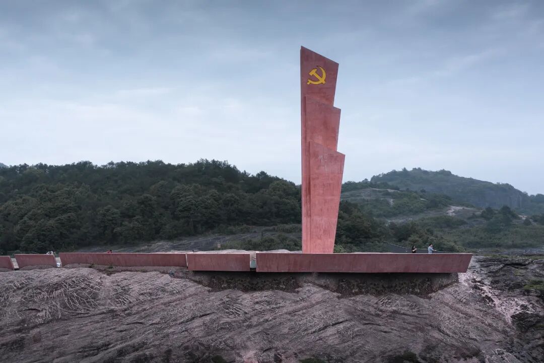 由于原始纪念碑位置隐蔽,且在一定程度上影响了上山的车行流线,因此决定在项目场地西南侧新建高度为19.27米的纪念碑,碑形如三面红旗,呈逐级攀升之势。场地保留了山体裸露的红岩,新建纪念碑仿佛生长于岩石之上,隐喻革命精神与未来的蓬勃生机,成为记忆之所的精神引领。