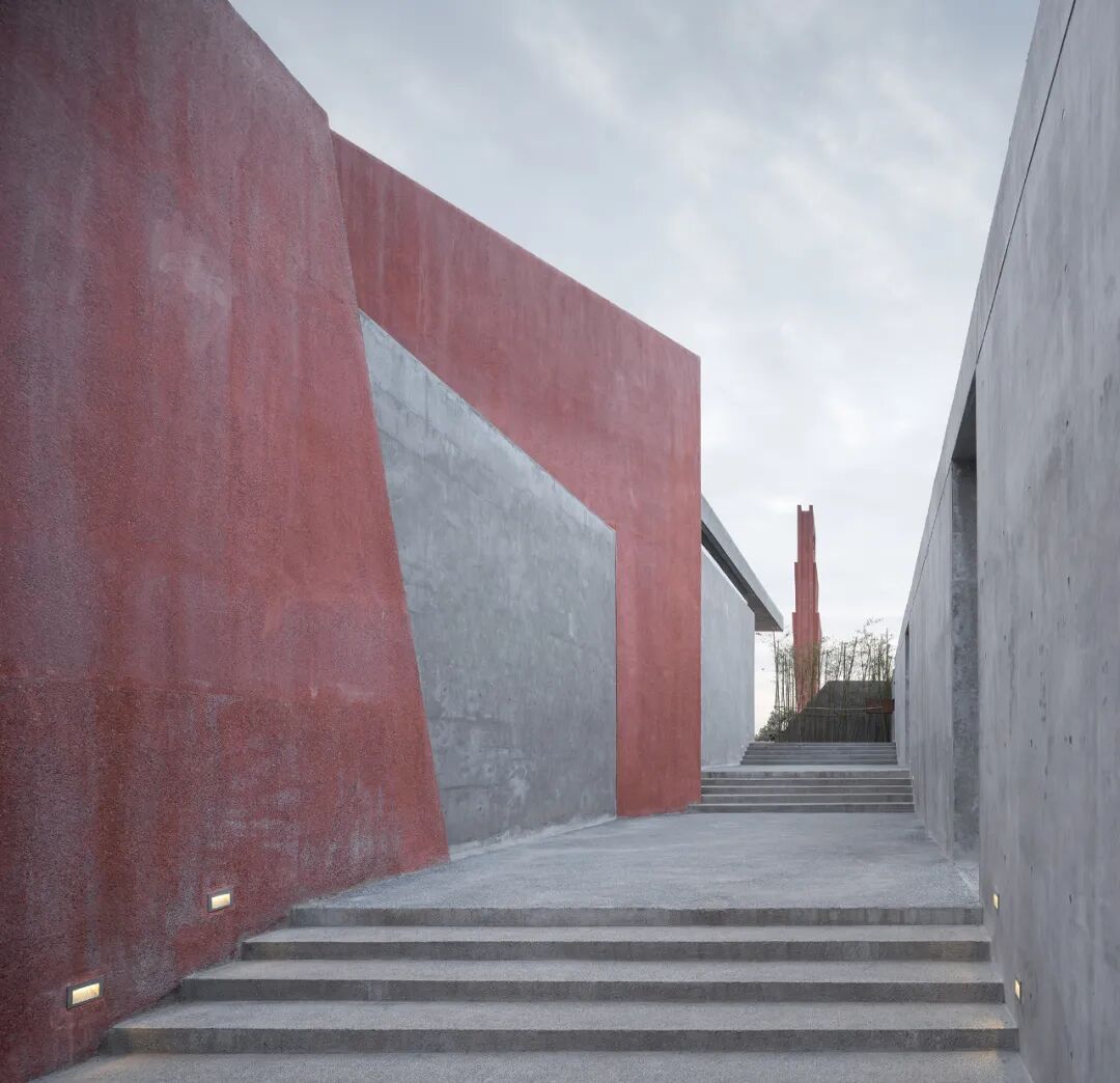 记忆,往往是许多离散的片段画面相互组合并自然涌现出整体印象的过程。原址的滴水崖壁,场地的逼仄红崖、磅礴群山、漫山黄花,我们提取这些非连贯但典型性极强的记忆片段,以一片片红色水洗石墙体为线索,在狭长的场地里有序组织不同的空间情境,通过情节引领,建构了富有叙事性与文学性的记忆之所。