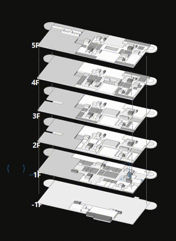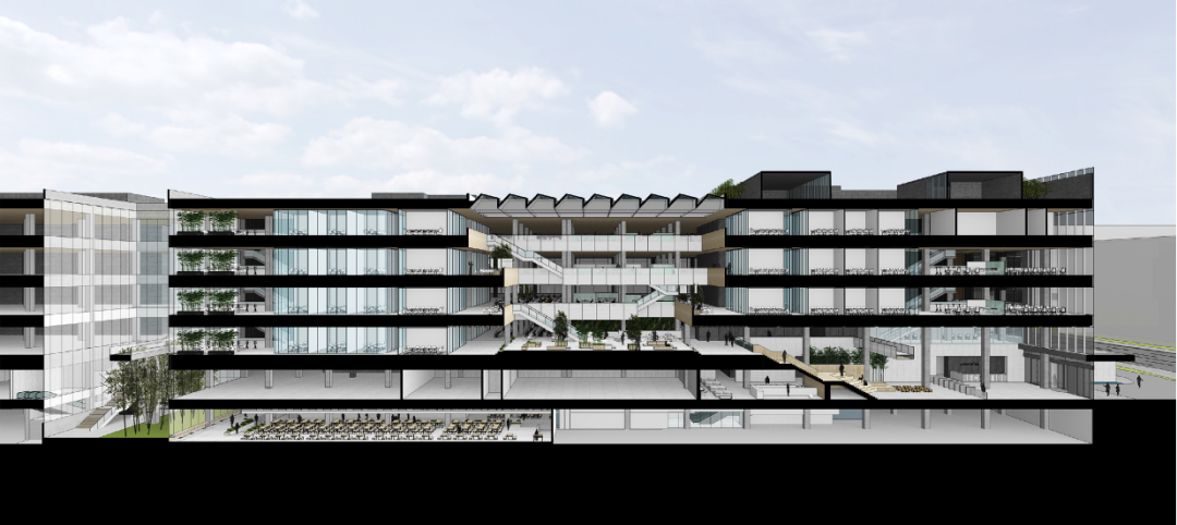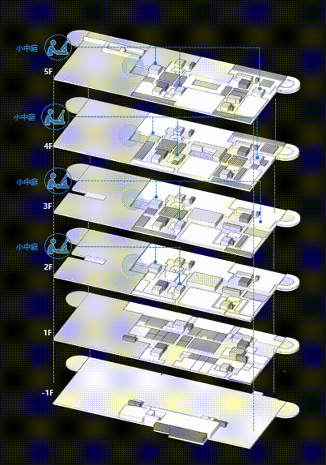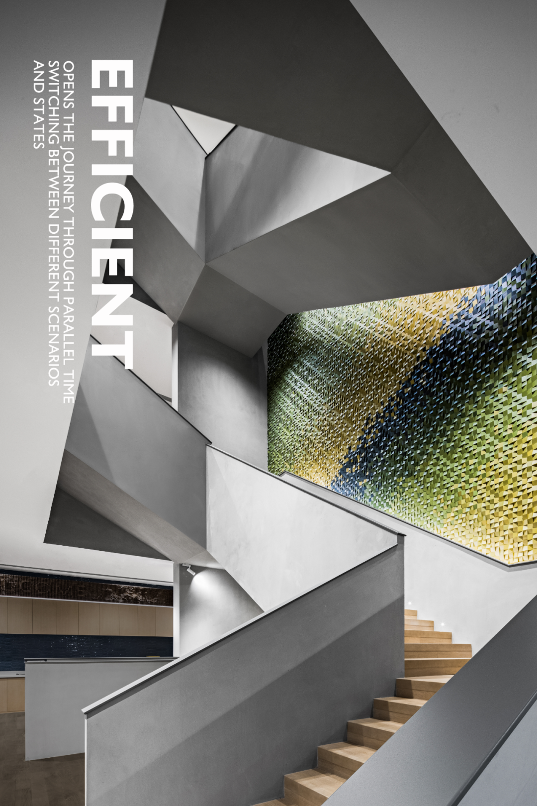 原有核心筒與新建入口合理佈置電梯,高效解決垂直交通設置小中庭與特色樓梯,層間便捷聯通,增設三條特色樓梯垂直交通動線。
