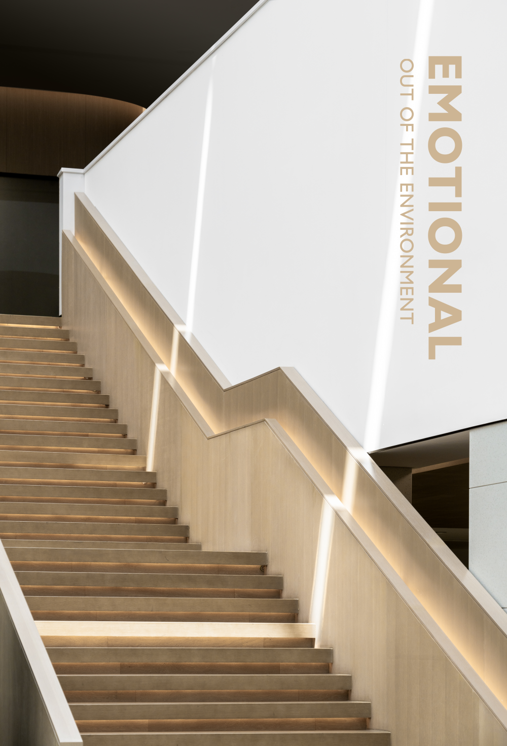 展廳的入口以盒子的形式呈現,昭示出其在大堂區域的獨立性和清晰的標識性。大階梯形式也為訪客和員工提供了在大堂臨時交流的地點,背面區域增設咖啡吧,可為領導力中心和員工提供洽談和非正式會談功能,豐富大堂功能。