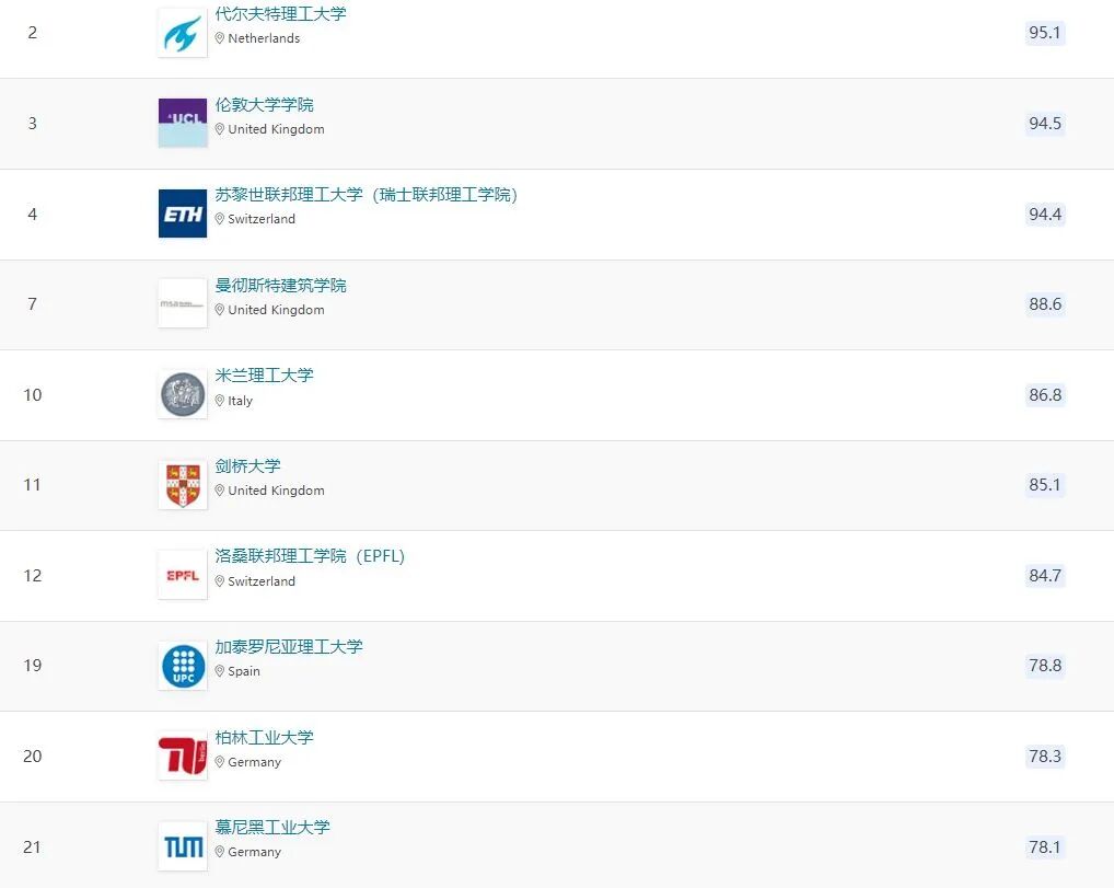 欧洲大陆排名中,代尔夫特理工大学和苏黎世联邦理工大学这两所高校都是非常优秀的建筑院校,并且申请都有着很多限制要求。TUD招收研究生要求必须是本科院校为211的学生。米兰理工大学近两年保持第十名的位置,2022年的普利兹克奖得主迪埃贝多·弗朗西斯·凯雷(Diébédo Francis Kéré)就是米兰理工大学的导师,预计明年米理的申请量会增加。