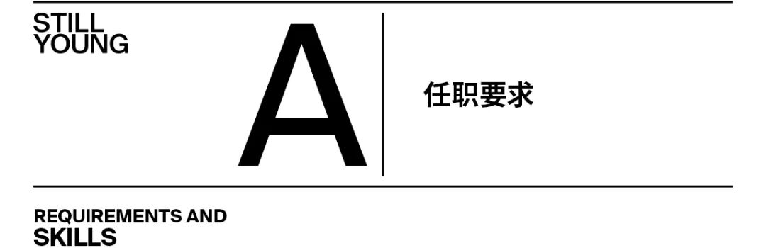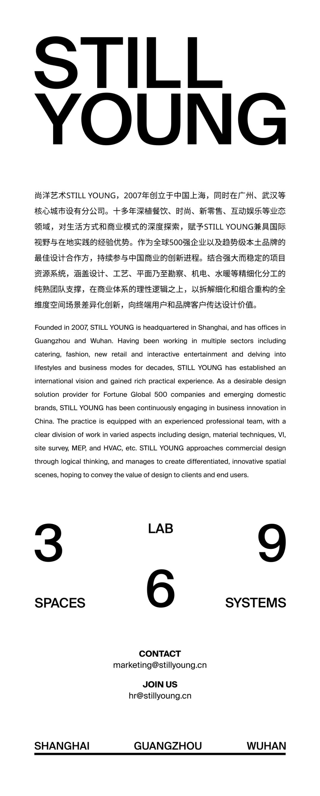 PRACTICE STILL YOUNG以「引领商业空间可续创新」为目标,专注服务全球500强企业以及趋势级本土品牌,提供兼具国际化与在地性的空间定制设计。创立至今十六年来,持续参与中国商业的创新进程,对生活方式和商业模式深度探索。 秉持“整体性”和“系统化”的终端思维,构建商业设计的全生命周期,面向长远的发展型消费升级,为品牌空间注入适变且经久的商业赋能。 △办公环境 PHILOSOPHY 作为诸多商业领导品牌的最佳设计合作方,STILL YOUNG一贯奉行的工作与服务理念在于Trust信任、Balance平衡、Sustainability可持续性,这三个关键词亦适用于其人才观。 依托强大而稳定的项目资源沉淀,架构起涵盖设计、工艺、平面、勘察、机电、水暖等精细化分工的极致团队,完成年创逾1,000个项目。个体的能量连接为循环加强的集合体,不断突破边界。 △往期项目 PLATFORM 中国随经济、科技、文化的发展,蕴生无限可能性的商业创新实践场,而对于参与其中的轻资产设计行业,“人”无疑是最重要的资源。 STILL YOUNG邀约全球范围的新锐设计师及创意型工作室,加入其针对连锁品牌“一店一设计”的LAB团队,将标准化的实操成果与实验性的原创设计相整合。在普遍内卷的大环境里,形成一种互补共益的良性机制,平衡设计与商业的关系,同时规避创意方案的落地性差以及独立工作室流动性大的弊端。 △始祖鸟北大湖山地课堂会员中心店 △M Stand武汉国广二店 POSSIBILITY 着眼于整个行业的改变,STILL YOUNG的愿景是建立引领行业的原创商业设计平台,以包容性和多元化的价值基础吸附新生代的创意精英人才,共建一个领先世界的中国设计生态圈。 超然的稳定性、持久的创造力、更强的执行力,得以在商业设计的快速变化中找到最合适的平衡点,既保持企业的高效运转,又让创新有一个灵活的环境。期待与企业所有伙伴及合作方共同成长,向终端用户和品牌客户持续创造设计的商业价值和社会价值。 POSITION - 参与分析并理解项目主题及定位,制定相关的创意和设计风格,配合项目组其他成员进行方案落地。 - 准确理解客户需求,提出与策略和创意相匹配的概念,并将创意概念发展成为具体的视觉表现。 - 负责项目从立项到落地等统筹协调工作。 - 具备商业空间的陈列装置及新方案策划落地。 - 有一定的商业设计研究,竞品分析能力。 - Participating in analyze and oversee all design projects, developing relevant creative and design styles, and cooperating with other team members to implement the program. - Accurately transforming customer specifications, putting forward the concept that matches the strategy and creativity, and developing the concept into a specific visual performance. - Responsible for the coordination of the project from conception to delivery. - Having the ability to plan and implement display installations and new programs in commercial spaces. - Having the ability of commercial design research and competitor analysis. - 本科以上学历,留学生优先录取,环境设计、室内设计、建筑等相关专业。 - 对连锁餐饮、零售设计有独到见解,具备创新能力。 - 精通空间设计操作软件,PS、AI、InDesign、CAD、Sketchup等。 - 时尚、专业、热情、关注,并对流行趋势敏感,审美能力强。 - 具有较强的专业能力、责任心、沟通能力、组织协调能力。 - Bachelor degree or above, international students are preferred, majoring in environmental design, interior design, architecture and other related majors. - Having unique insights into chain catering and retail industry, and the ability to think creatively and deliver impressive concepts. - Proficienting in design softwares (e.g.PS, AI, InDesign, CAD, Sketchup, etc.) - Fashionable, professional, enthusiastic, focused with strong aesthetic skills, staying up to date with industry trends. - Strong sense of responsibility, communication skill, and coordination skill. - 熟悉使用3DMAX、CR等效果图制作相关的软件。 - 1-3年的相关工作经验。 - 对效果图制作有自己的思考和感悟,接到工作任务时,能快速制定制作方案,理解制作要求 - 相关设计专业毕业,对工装有相关的经验优先考虑。 - Proficient in 3DMAX, CR and other rendering related software. - 1-3 years of relevant work experience. - Be able to quickly develop a production plan, understand the requirements, and have their own thinking and perception. - Graduation of related design majors, with relevant experience in industrial decoration is preferred. 上海市静安区 Jing'an District, Shanghai 武汉江汉区 Hanjiang District, Wuhan - 根据不同的设计风格完成线上画册排版呈现工作。 - 按照客户给的订单要求完成线下围挡等其他海报的设计工作。 - 公司内部图片处理(包括不限于小红书、咸鱼所需要素材排版及精修等)。 - Be able to complete the online album layout and presentation work according to different design styles. - Be able to complete the design work such as offline hoardings and posters based on customer requirements. - Process company internal images, material layout and finishing (including Xiaohongshu, PoshmarkInc, etc.) - 平面工作经验至少3年以上。 - 做事有责任心,有耐心,不拖延时间。 - 审美在线,理解能力强。 - At least 3 years graphic working experience. - Be responsible, patient and meet with deadline. - Great comprehension and aesthetic skill. - 精通CAD并可以独立完成整套施工图的绘制,包含平面图、立面图、节点图。 - 可针对风格各异的不同店型,具备图纸深化能力。 - 对工艺结构有一定的了解,有现场勘测及交底的经验