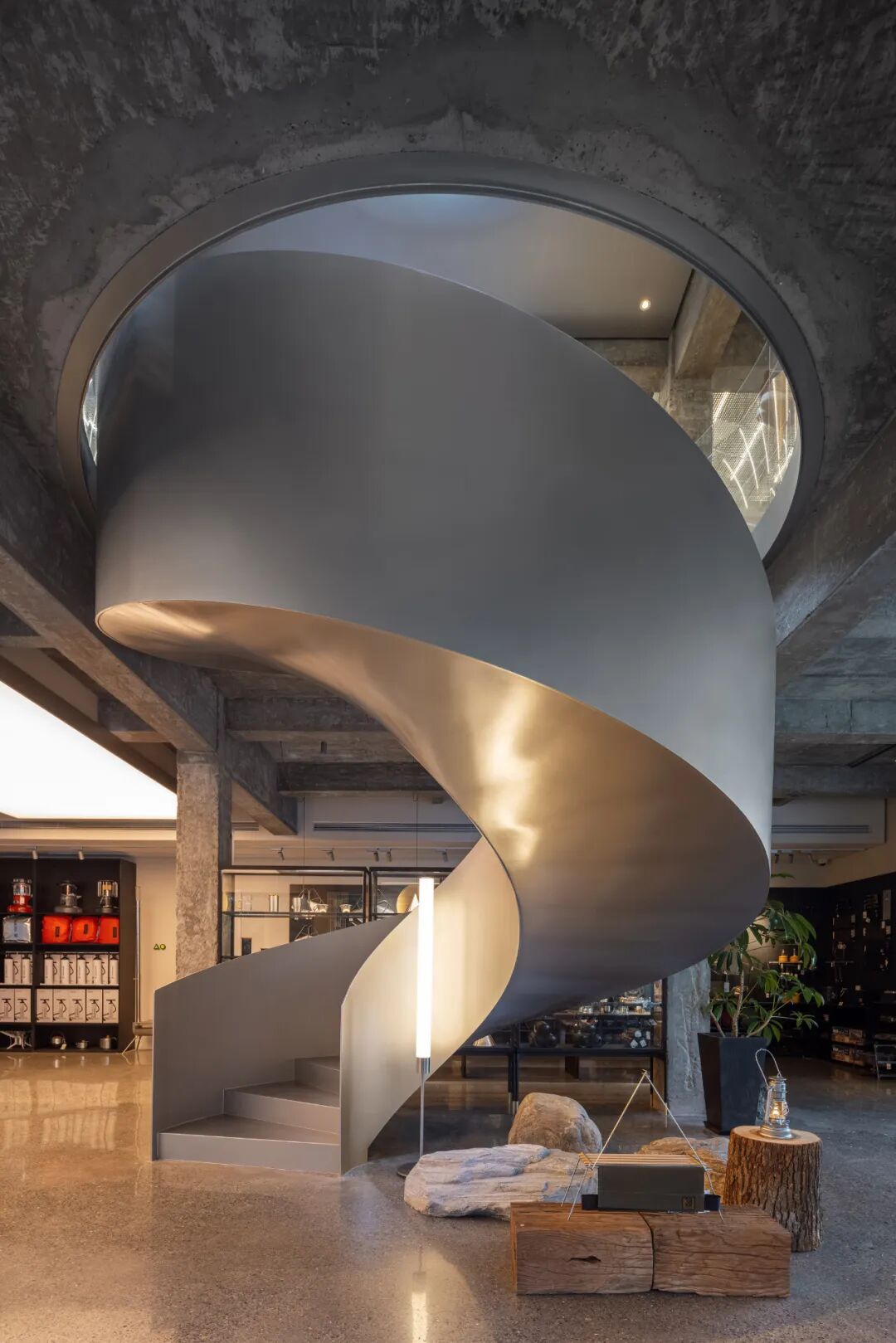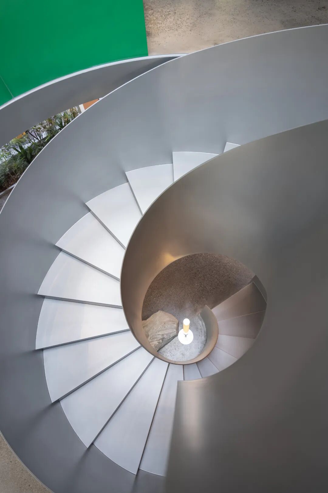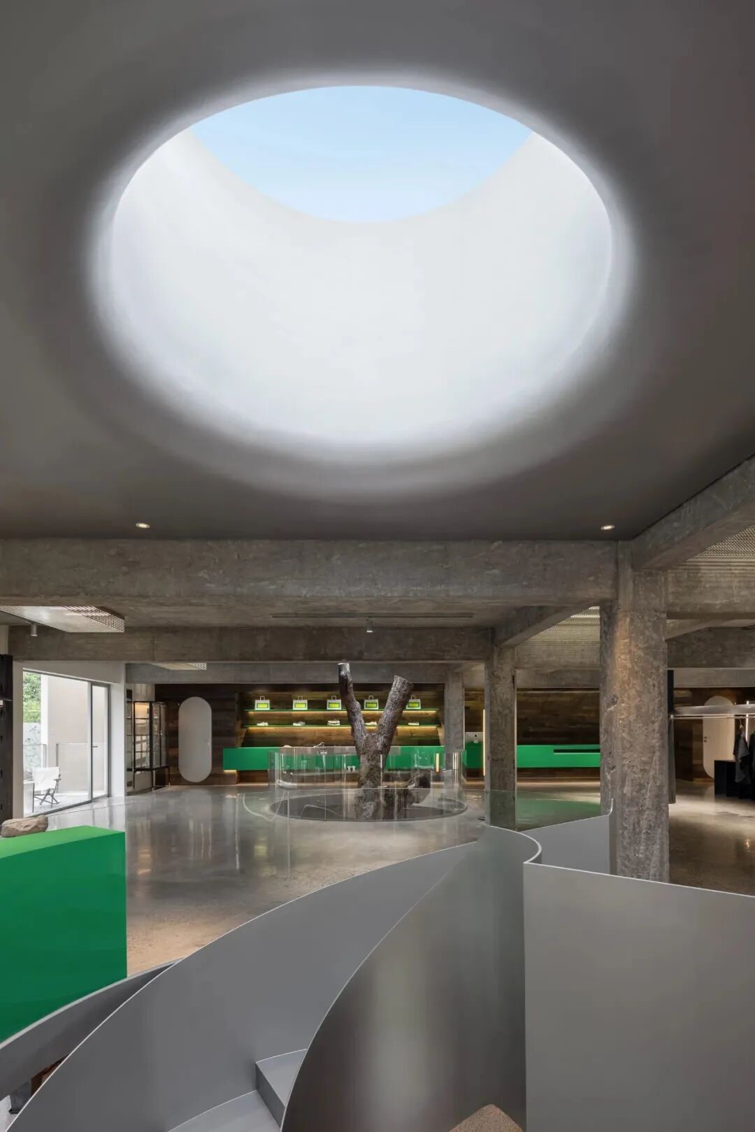 天井之一为旋转楼梯,成为一楼上至二楼的通道,不锈钢与素水泥的搭配,像极了外太空的金属感与未来感,登上楼梯仿佛正在踏上太空飞船。另一个天井开凿在对称位置,将一颗巨大的树干移植至此,从一楼穿过天井探向天空,寓意着生命的探索。