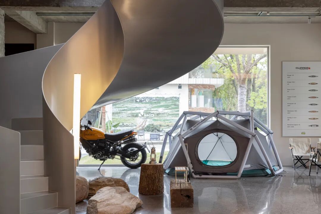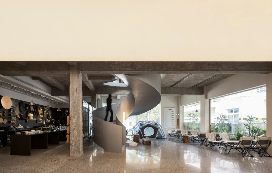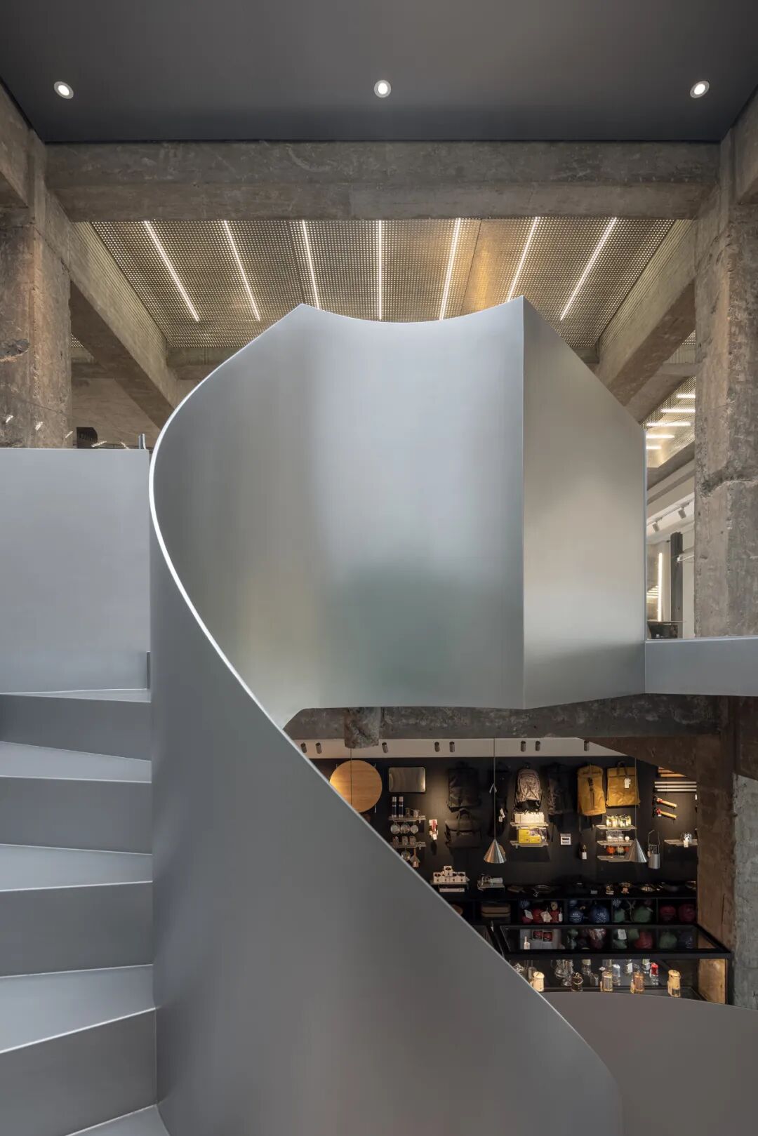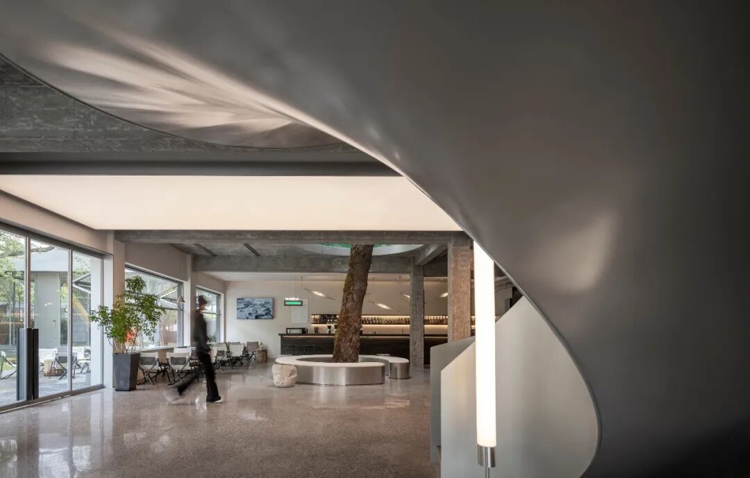 天井之一为旋转楼梯,成为一楼上至二楼的通道,不锈钢与素水泥的搭配,像极了外太空的金属感与未来感,登上楼梯仿佛正在踏上太空飞船。另一个天井开凿在对称位置,将一颗巨大的树干移植至此,从一楼穿过天井探向天空,寓意着生命的探索。