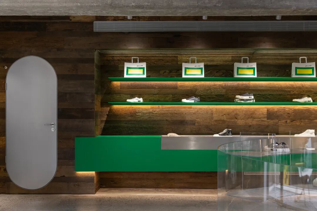 很多人都被UFO的绿色所吸引,这是UFO独有的标志色,出自著名平面设计师梅数植老师之手。闪闪的绿搭配鲜黄,既象征着户外,象征着活力,又代表着时尚。店铺设计中将该色彩提取并延伸,在空间内轻轻点缀。
