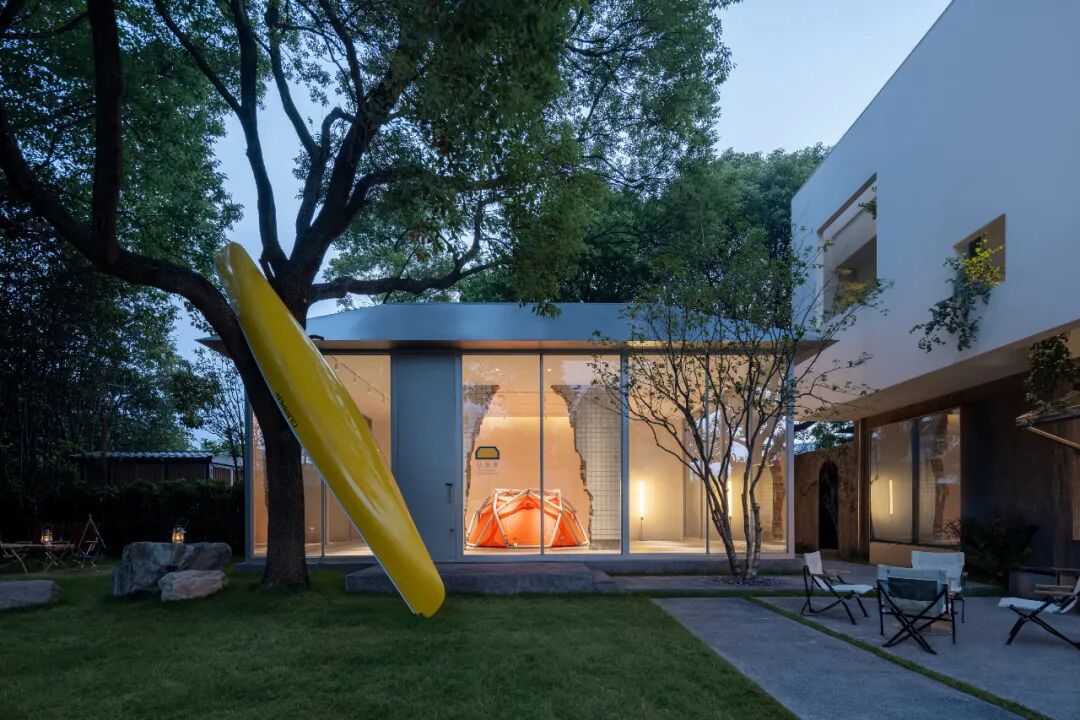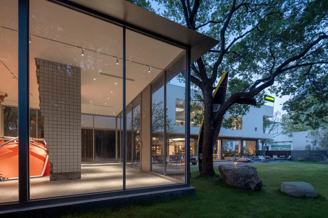UFO侧面有栋独立的玻璃房,取名为“UFO游牧空间”。设计中刻意保留了一些残存的砖墙,外罩透明玻璃盒子,与主体建筑的外壳概念相呼应,同时透明玻璃与金属屋顶营造出空间站的氛围感,打起灯光,像是一场别致的舞台秀。