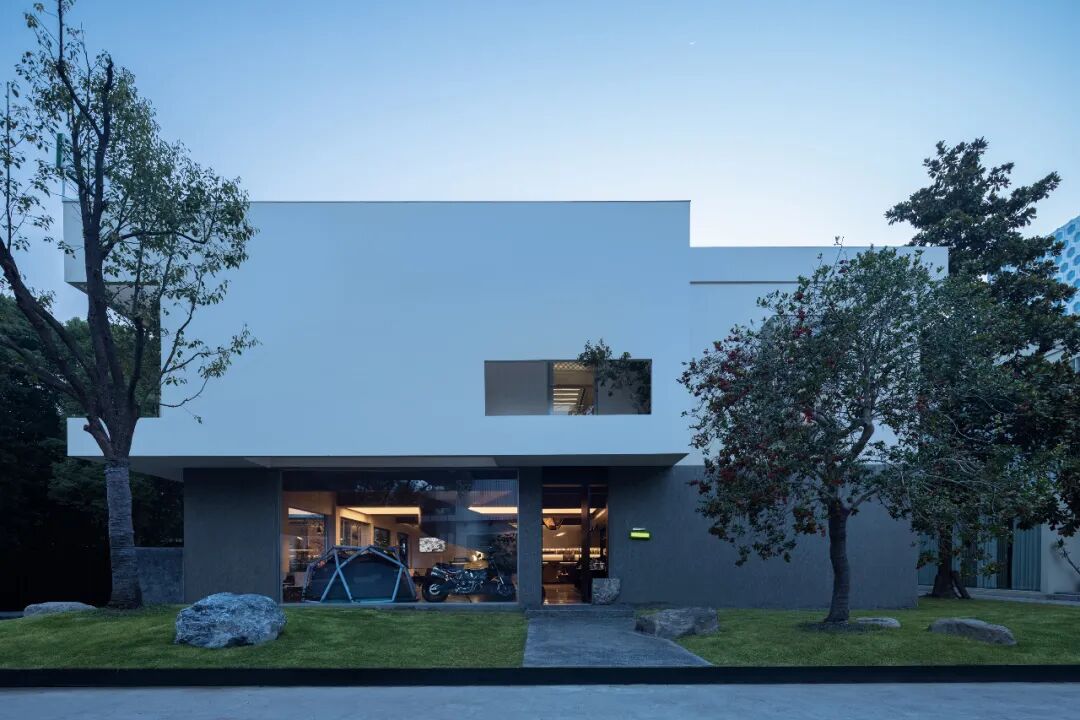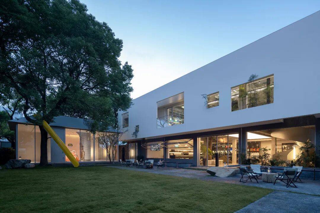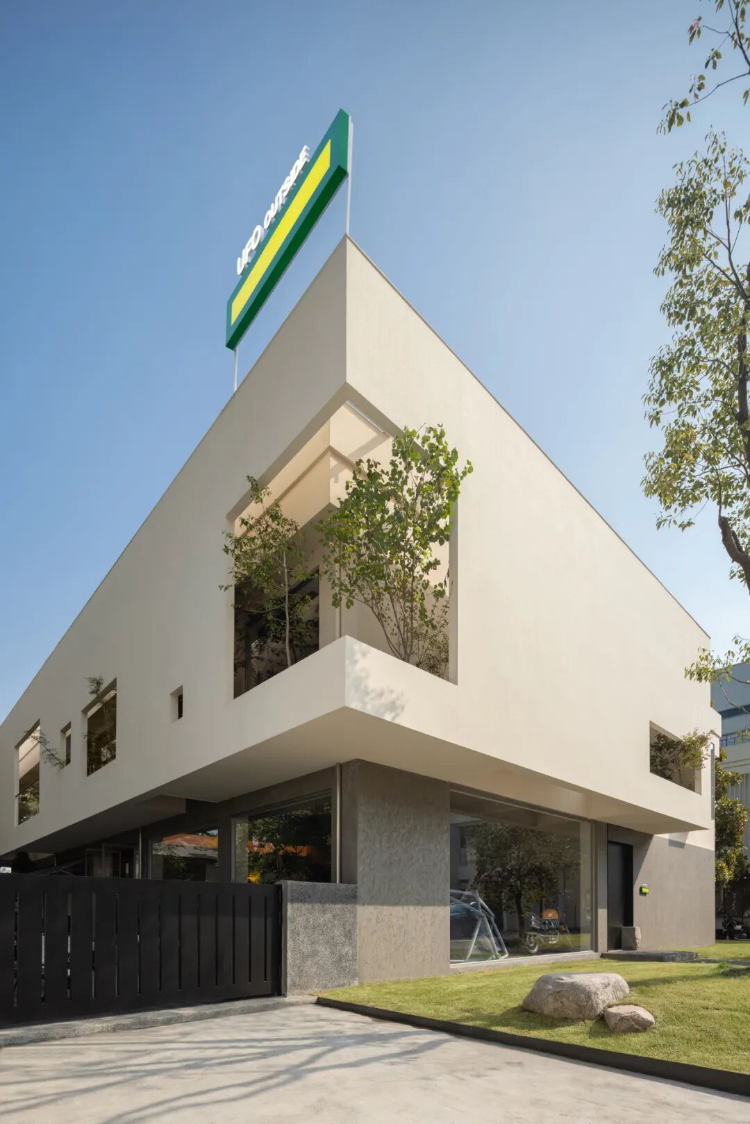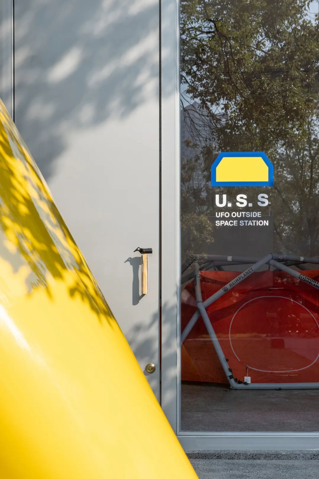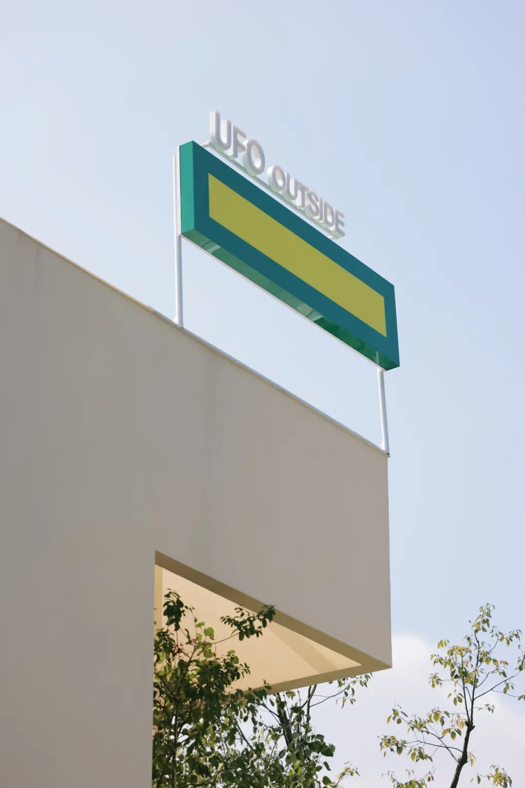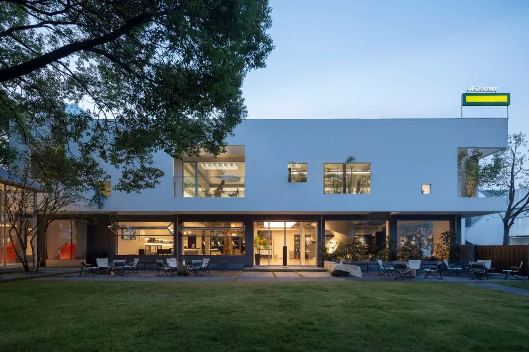 UFO由一栋两层建筑和一幢独立玻璃房组成,外加750平米的大草坪。原建筑平淡无奇,设计中围绕案名“UFO(不明飞行物)”展开,衍生出“等待起飞的UFO”概念,对建筑进行了包裹改造。