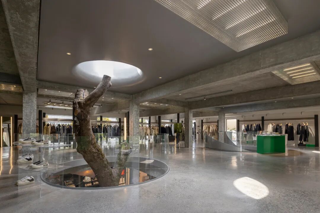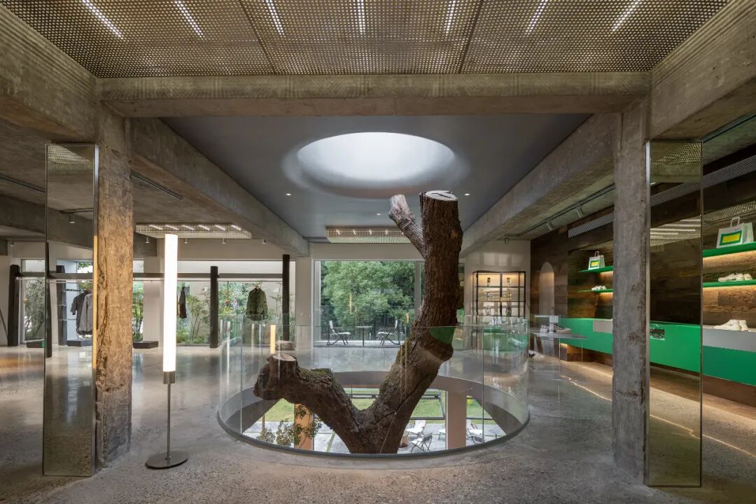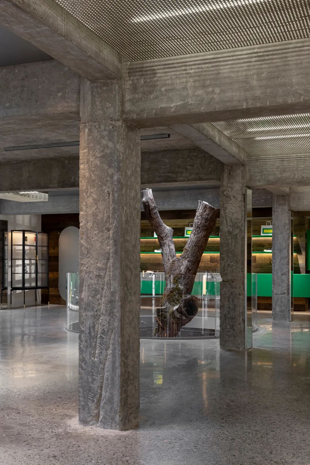 探索生命的巨型树干,从一楼穿透二楼直至天空,光影在地面随着时间推移而变换。