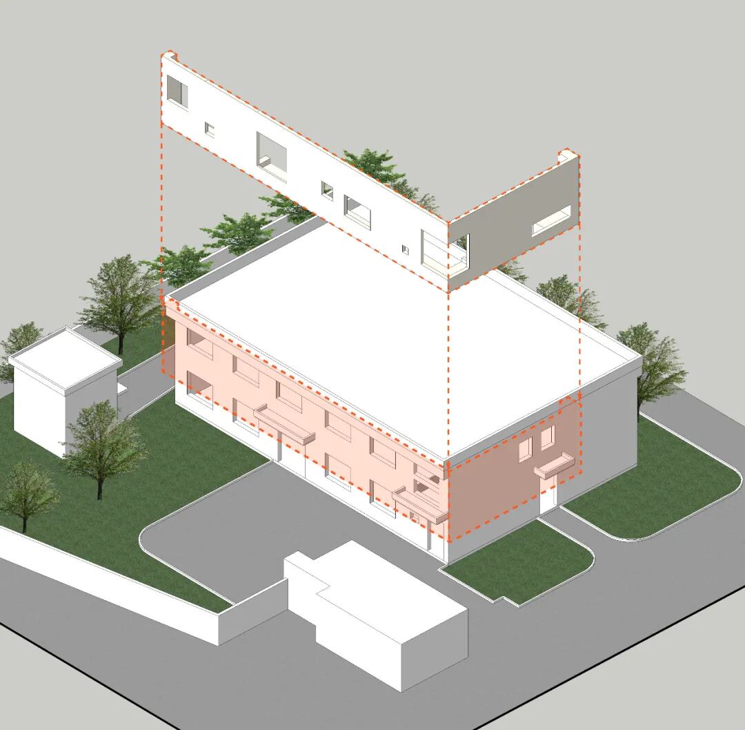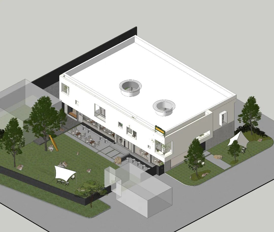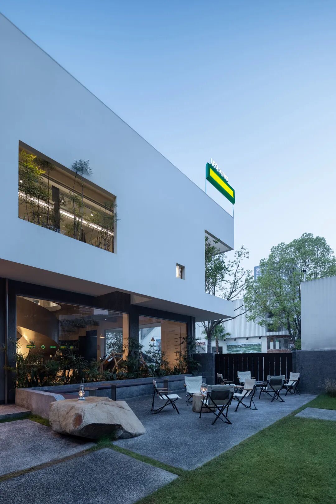以一楼原有的外挑屋檐为底座、在二楼的北与西两个侧面叠加一层外壳包裹,并错落开窗,由此形成的与建筑之间的悬挑地带成为UFO特有的露台区,将各类植物种植于此,枝叶从大大小小的窗口中探出,原本平淡无奇的外立面因此变得生机盎然。包裹后的建筑仿佛一架正待起飞的外太空装置,现代感十足。