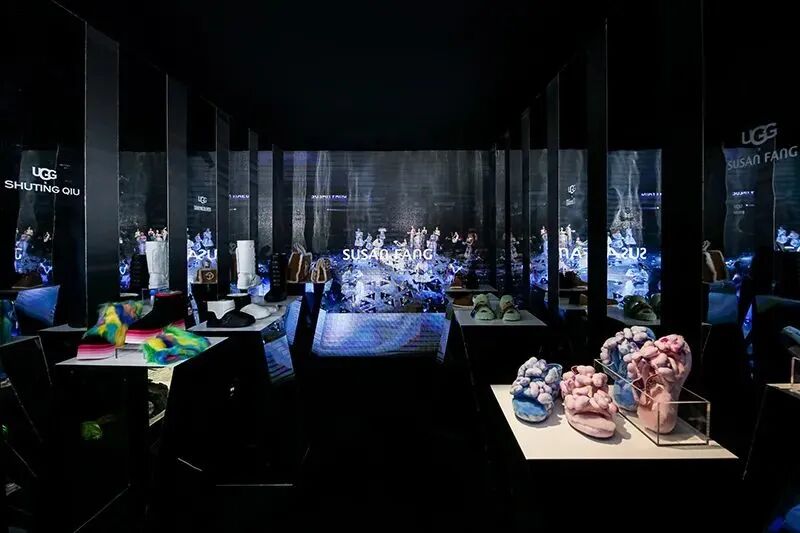 这次现场带来了多个产品系列,展厅一侧是 UGG X Feng Chen Wang 联名系列,另一侧则包括了 UGG X CHILDREN OF THE DISCORDANCE、UGG X SHAYNE OLIVER、UGG X TELFAR、UGG X SHUTING QIU、UGG X SUSAN FANG 和 UGG X ALINENANT 等联名系列。
