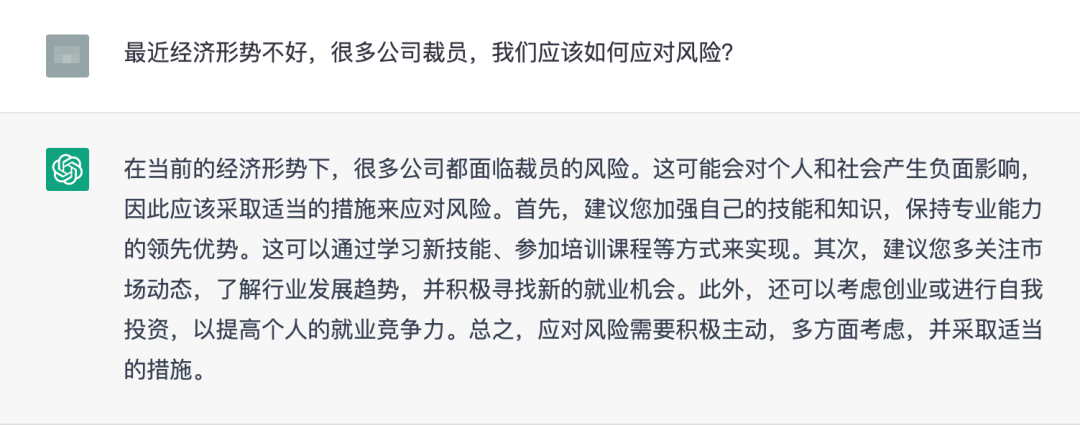 而真正有价值的信息,一定是稀缺的,例如我之前问 ChatGPT 如何应对糟糕经济形势下的裁员风险,得到了一大堆网上随处可见的“套话”,看起来是有道理,但是一点用处也没有。