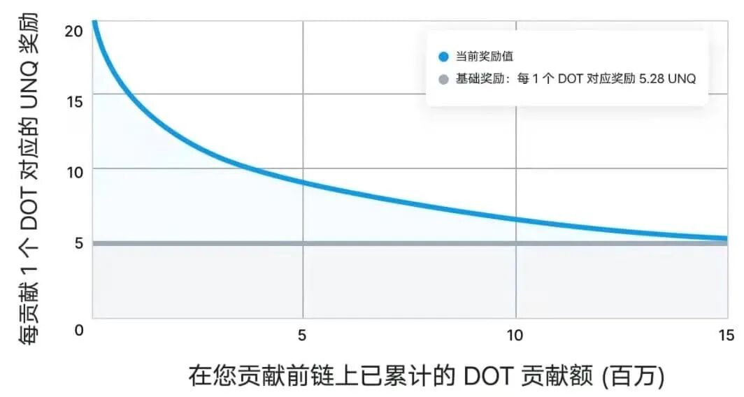 最多 150,000,000 UNQ 将分配给众贷贡献者。奖励将根据如下所示的曲线确定。越早贡献,收到的 UNQ 越多!第一个 DOT 贡献将获得 20 UNQ,最后一个 DOT 贡献将获得 5.28 UNQ。