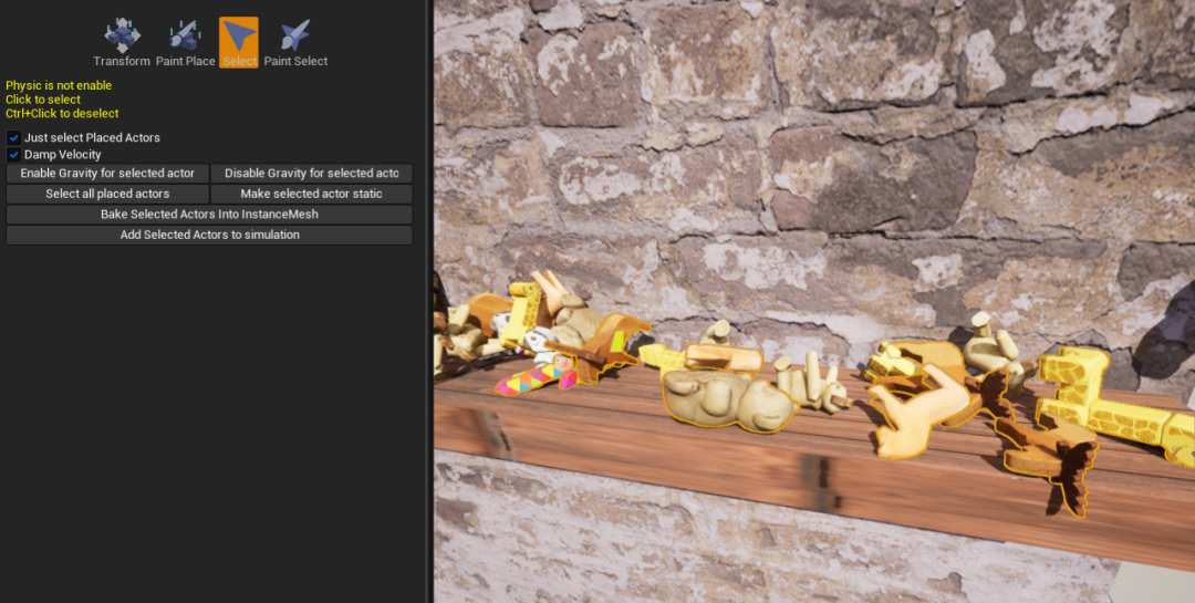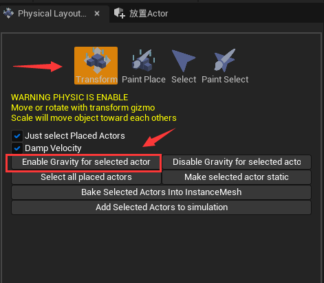 在“Transform”中,可以选择Actor并进行移动旋转和缩放,点击“Enable Gravity for selected actor”可以开启重力模拟效果,点击“Disable Gravity for selected actor”则关闭重力模拟效果。