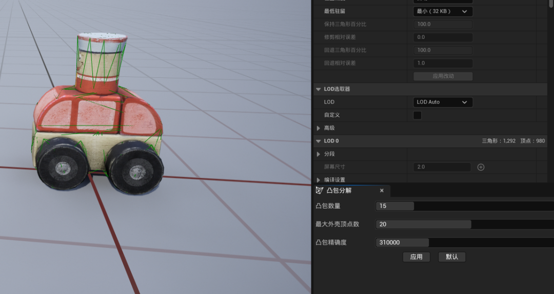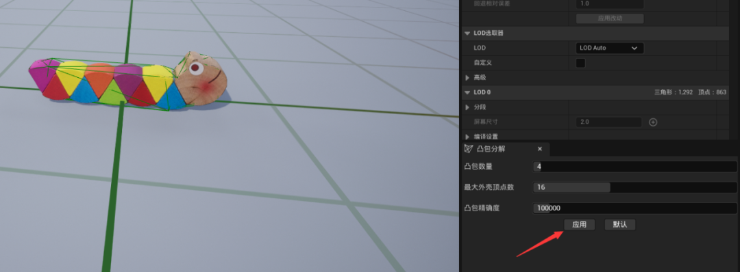 双击静态网格体后,在网格体编辑面板中找到凸包分解,适当调节参数并点击应用,会根据网格体的模型自动添加碰撞体,当然这里也可以使用自己导入的碰撞体。