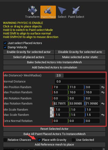 调节一些随机值,设置最小距离、法线距离、移动选择缩放的最大最小随机值。