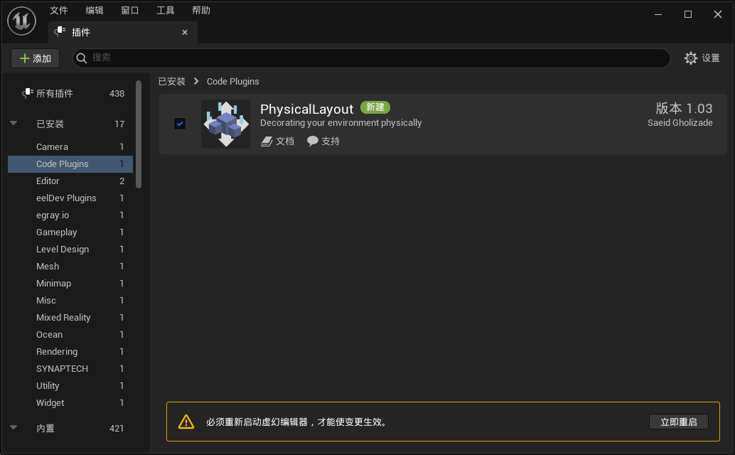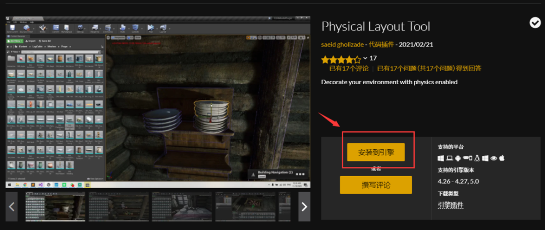 在虚幻商城永久免费内容中,可以找到“Physical Layout Tool”,物理布局工具插件,这个插件为场景中摆放物件提供了一些便利。