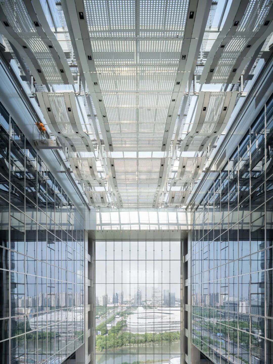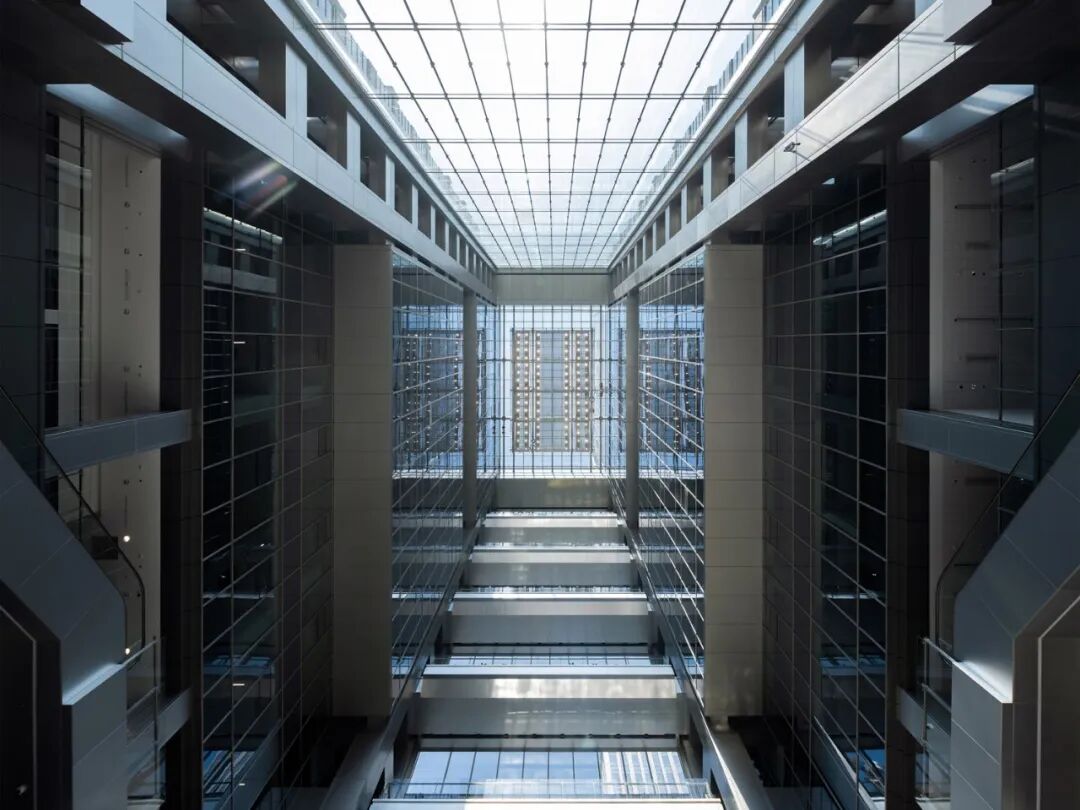 A cable-net glass curtain wall is used for the east facade of the atrium, creating an extraordinary transparency and clarity by hiding the anchors and spring assemblies in an ingenious way.