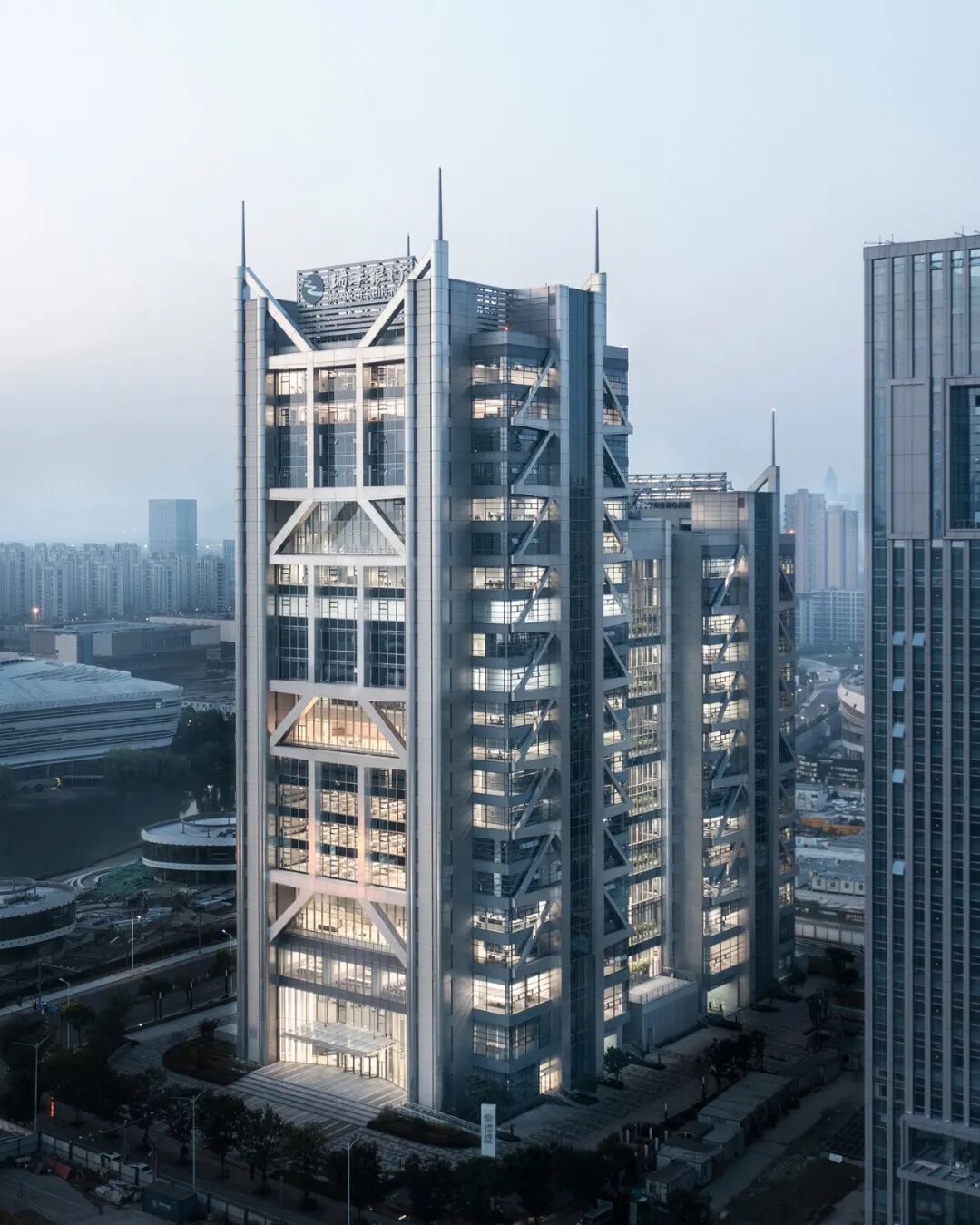 Located in the central position of Jinghu New District, Shaoxing, Zhejiang Province, the Exo Towers is comprised of two towers, being 15 and 21-storey high respectively, and linked together by a 70m-high central glazed atrium.