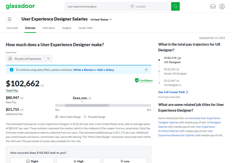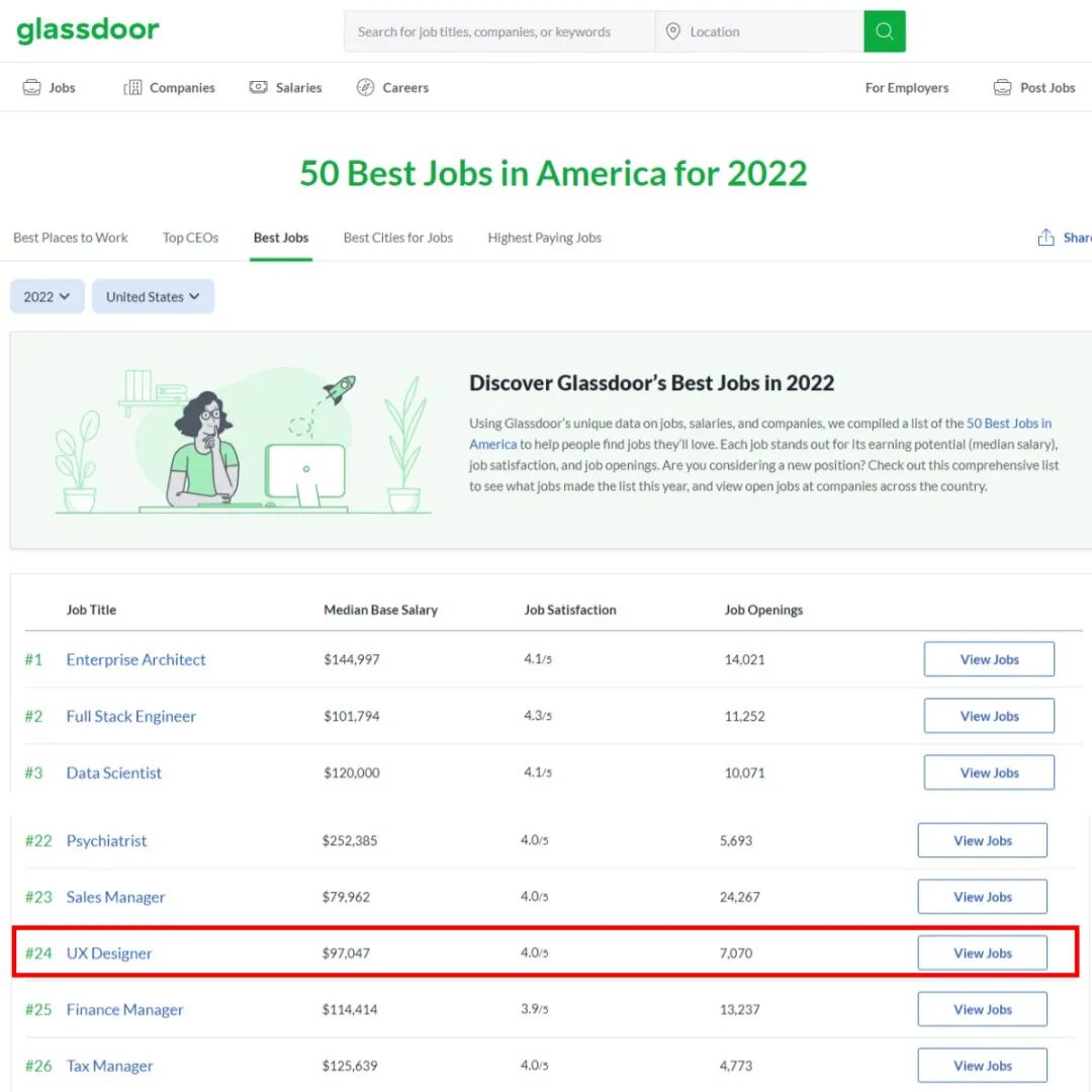 根据Glassdoor统计,美国UX设计师的平均基本工资为112,308 美元。根据收入潜力、工作满意度和职位空缺总数,UX设计被Glassdoor列为2021年美国50个最佳工作之一。但我们需要知道,我们的收入取决于许多因素,包括地点、行业、公司和多年的经验。