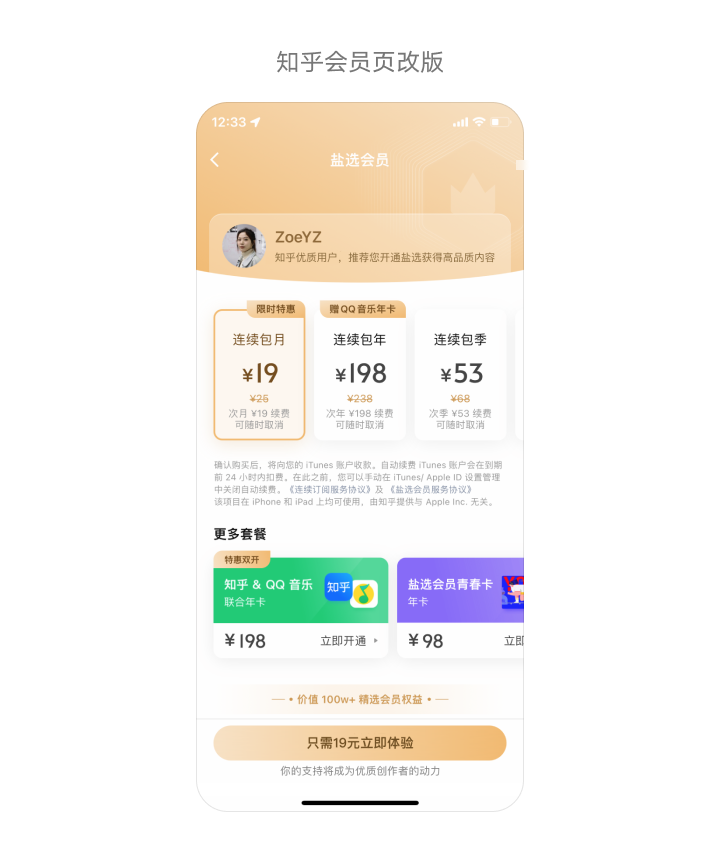 通过“推荐”和“高品质”,让用户感觉没有被强迫,并且看到了会员的价值。