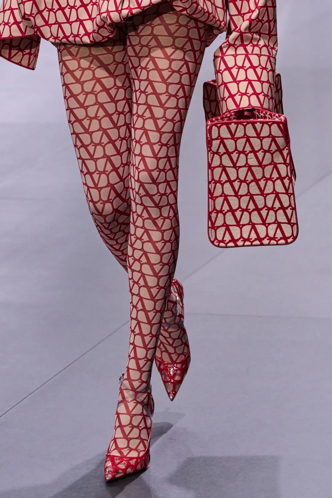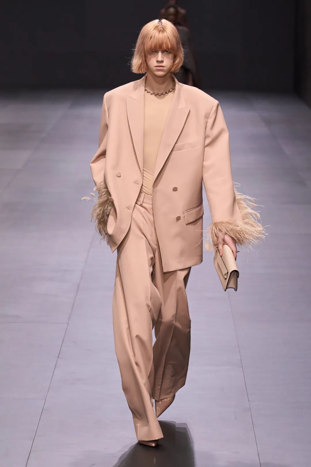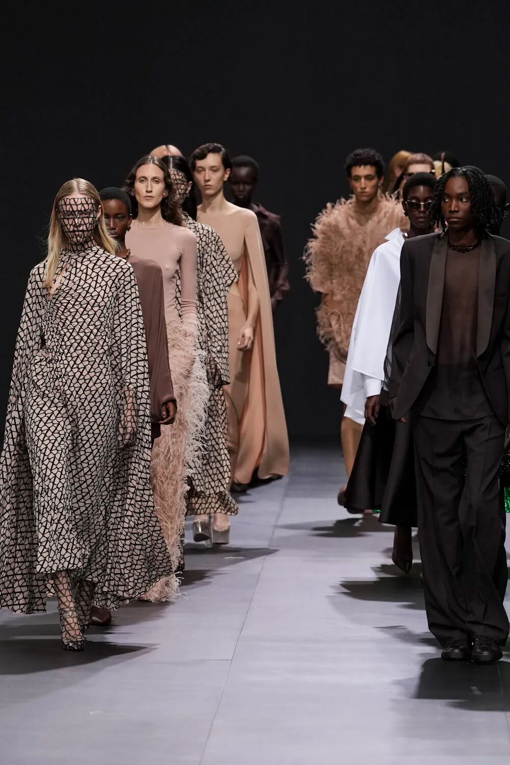 Valentino 2023春夏系列在颜色上不再张扬,虽然也运用了高饱和度的黄色、绿色、蓝色,但设计师更多地关注到了“人”的本身,即不同的人种拥有不同的肤色,所以秀场中出现了更多低饱和度的中性色以及黑色。