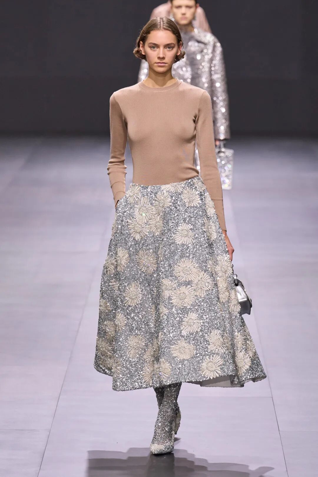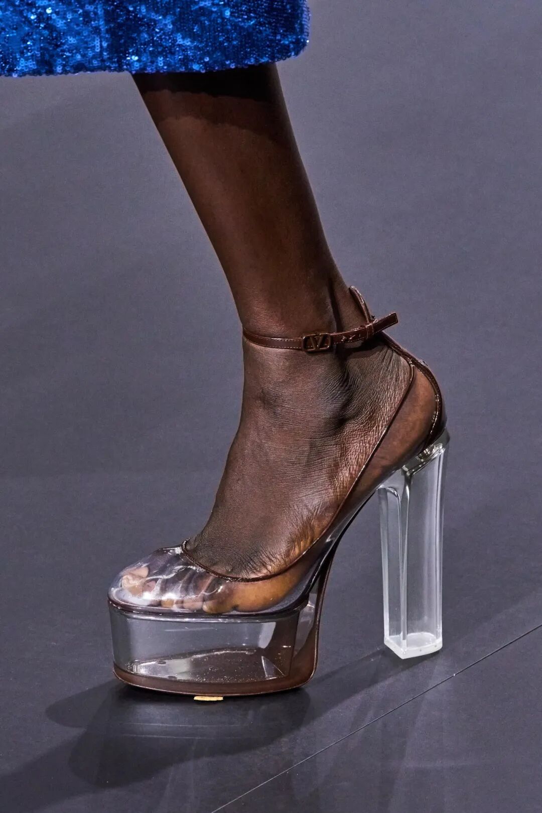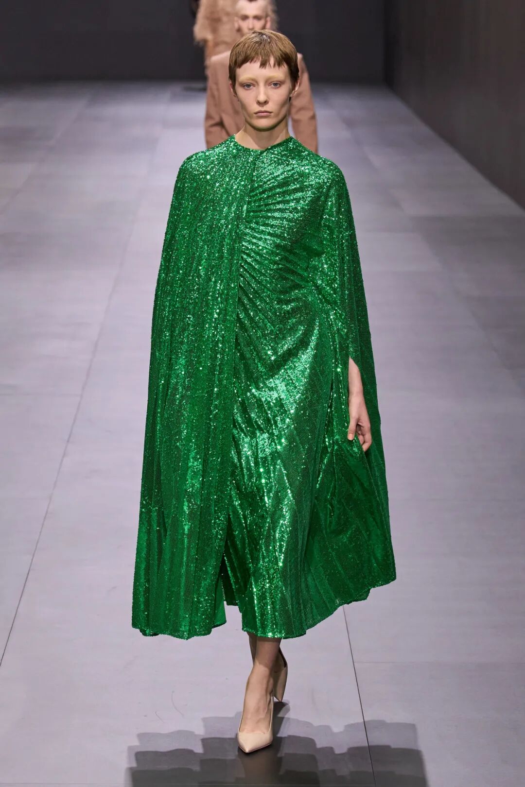 Valentino 2023春夏系列在颜色上不再张扬,虽然也运用了高饱和度的黄色、绿色、蓝色,但设计师更多地关注到了“人”的本身,即不同的人种拥有不同的肤色,所以秀场中出现了更多低饱和度的中性色以及黑色。
