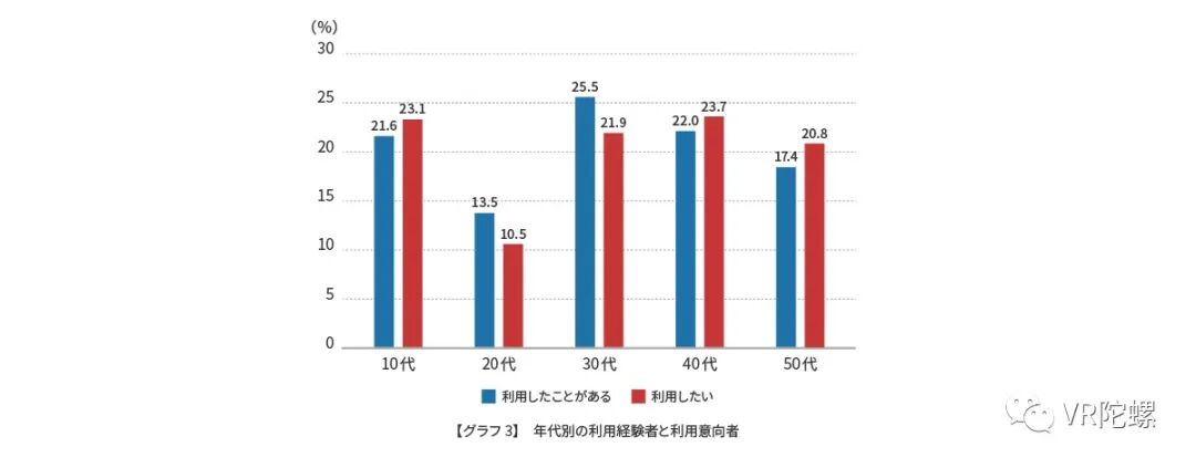 按受众年龄来看,30 代(30-39 岁)是使用过 VR 用户群体中最多的年龄层,占比为 25.5%,而 20 代(20-29 岁)却是使用过 VR 用户群体中占比最少的年龄层。