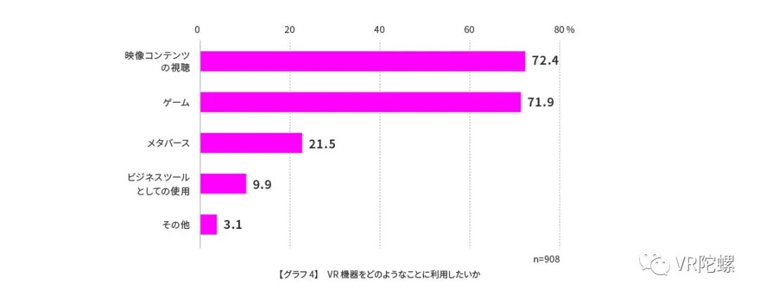 “我想看有现场感的运动比赛,想看 VR 的电影、视频”(男性/40代)。“VR 可以像在现场那样,享受偶像游戏,所以想体验一下”(女性/30代)。