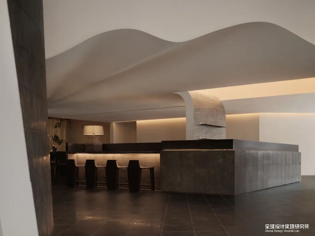 主入口部分打破常规,采用实心厚重的木门,在缓缓打开的瞬间,让进店的客人实现从喧闹的街区到静谧空间的转换。穿过厚重木门的玄关区域,首先看到的是一面富有强烈张力的背景墙,用流畅的线条弱化墙体的棱角,搭配黑灰色系的木岩板,营造出山川峡谷的宏伟质感。一楼的吧台部分,采用多维度的曲面契合的意境,具象亦抽象。强大张力的屋顶空间结构,塑造一个雅致的有温度的用餐空间,希望让客人在就餐时也能够感受到,空间带来的舒适与亲和力。