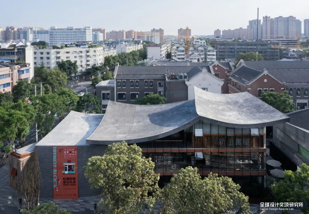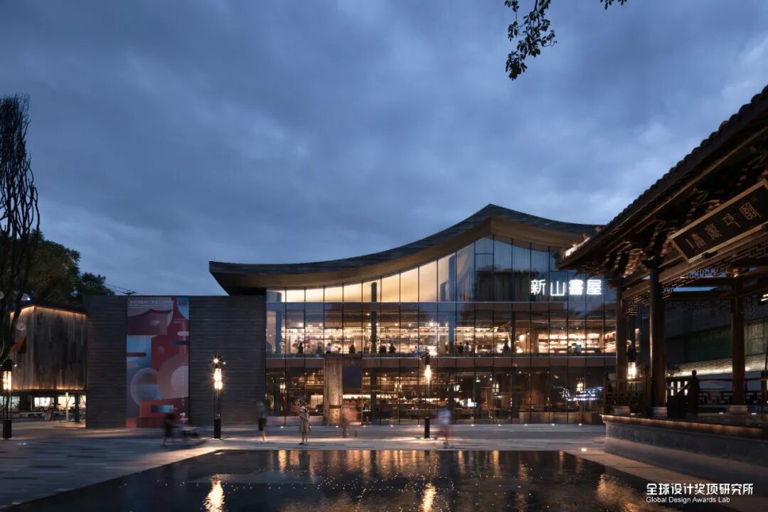 建筑形体的塑造上师法中国传统古建的飞檐翘角,取法抽象的书页。高透的玻璃幕墙减弱建筑体量的厚实感,同时满足阅读时需要的自然光照。到了夜晚,暖黄色的灯光从室内透出,广场水面上倒映着的建筑轮廓宛若纷飞的“书页”。正对“南街”的东立面,错动悬挑而出的原木包裹的体量如一个悬浮的乌托邦,吸引人们前往。属性较内向的南立面用水平高窗和错动的窗洞引入自然光,打破沉闷。原木、条石面砖和预支混凝土的沉稳彰显出书店的静谧,高透的玻璃幕墙为书店带来更多的开放性。天光从穹顶处蔓延进室内。