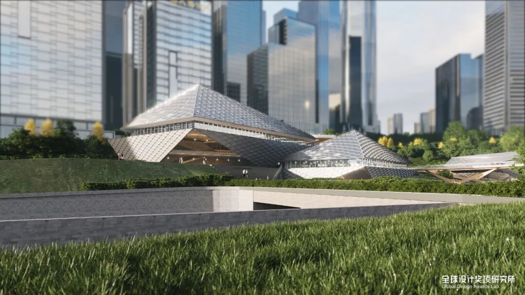 方案立足于江北嘴金融街主轴,打造畅联优达、多元聚集、持续共荣的西部金融中心地标名片——两江星钻。我们取钻石之几何形态来塑造这个世界级的城市地标。建筑以钻石独特的切面,形成了从渝中半岛,嘉陵江面,北滨路以及金融中心俯视等各个城市角度观赏的独特空间造型。地景之上的三颗钻石互相映衬,形成独特的下沉景观,山地峡谷,城市平台等丰富的交互空间。下沉广场形成的流动水面标识着入口,智能交互场景随着人们拾阶而下缓缓映入眼帘。巨幅的斜切钻石玻璃面作为整个金融科技文化展演区的入口,迎接着四面八方的访客,建筑之间形成供人们休闲的独特山地峡谷场域,水景,艺术,多样的活动与景观合而为一。随着“凤翼”穿梭的城市载体与环境的互动,鼓励信息交流,吸引人才汇集,激发创造,共同受益,与江北嘴CBD 共成长。