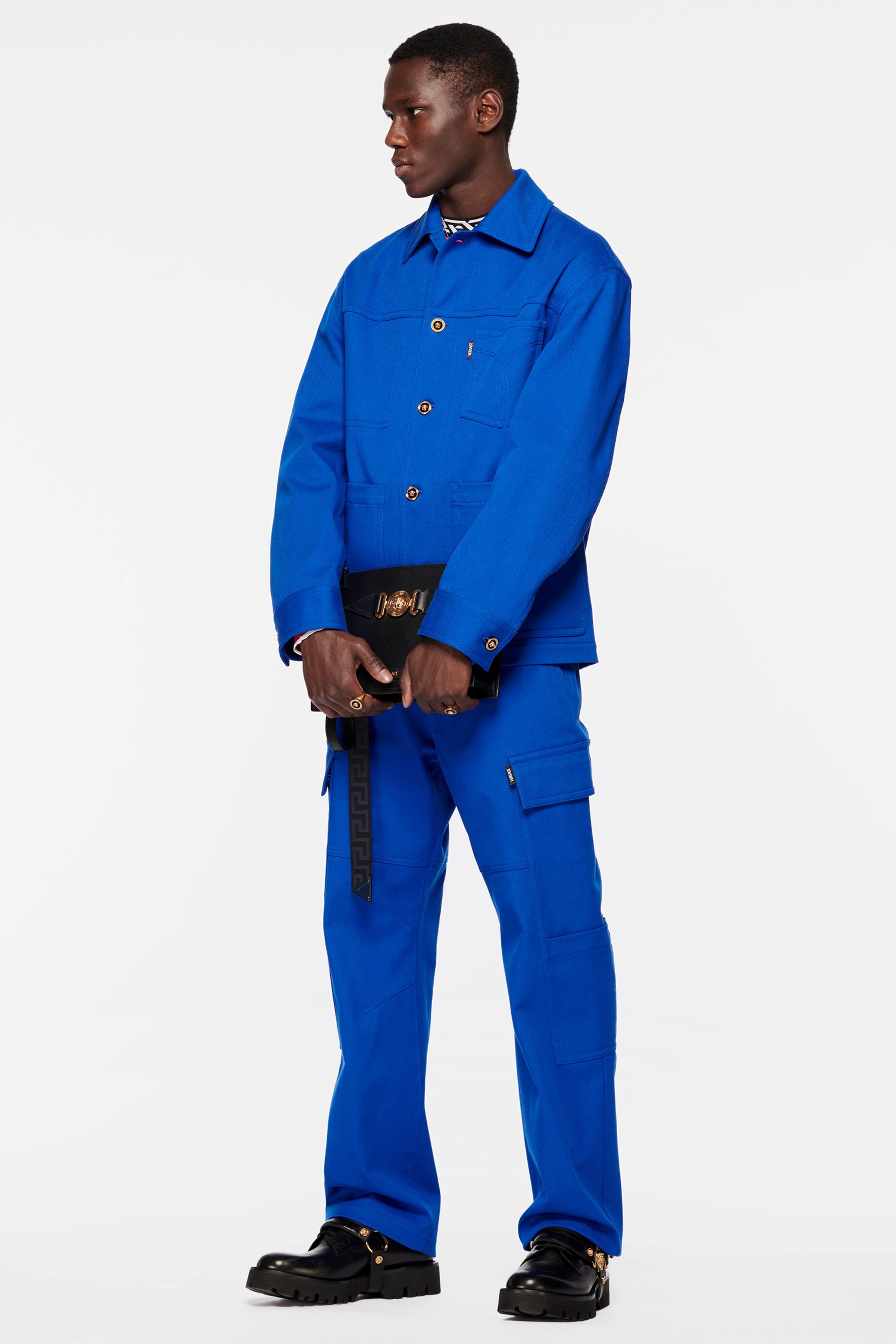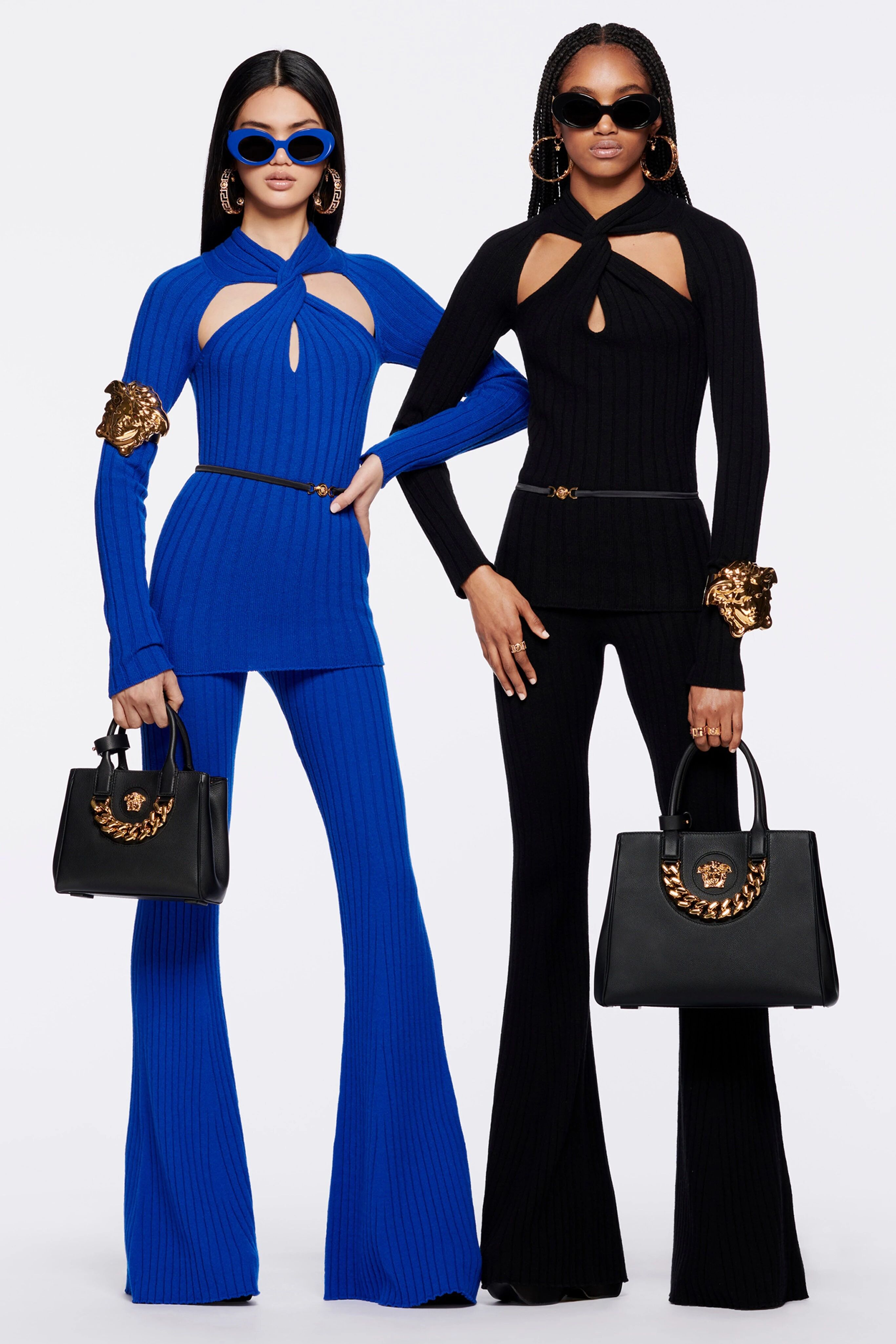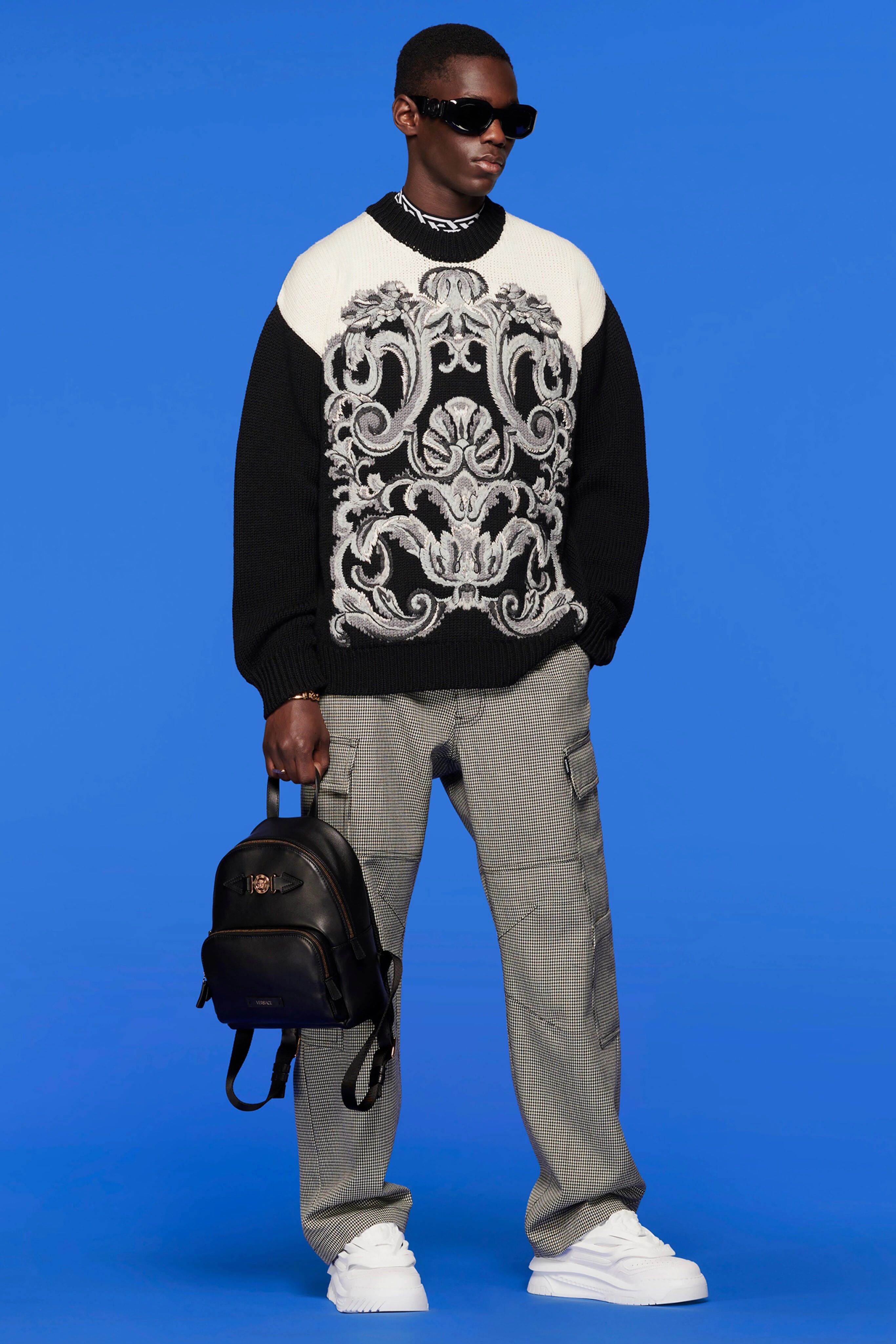 本季女装,令人印象深刻的巴洛克图案与回纹迷宫图案依旧贯穿始终,配合跳跃的粉蓝色彩,呈现出华丽夺目而又带着潮奢味道的迷人魅力。层出不穷的单品或性感、或街头、或实穿、或精致,将最能突显 VERSACE 风格的元素一贯使用,塑造出时髦自信且气场强大的女性形象。