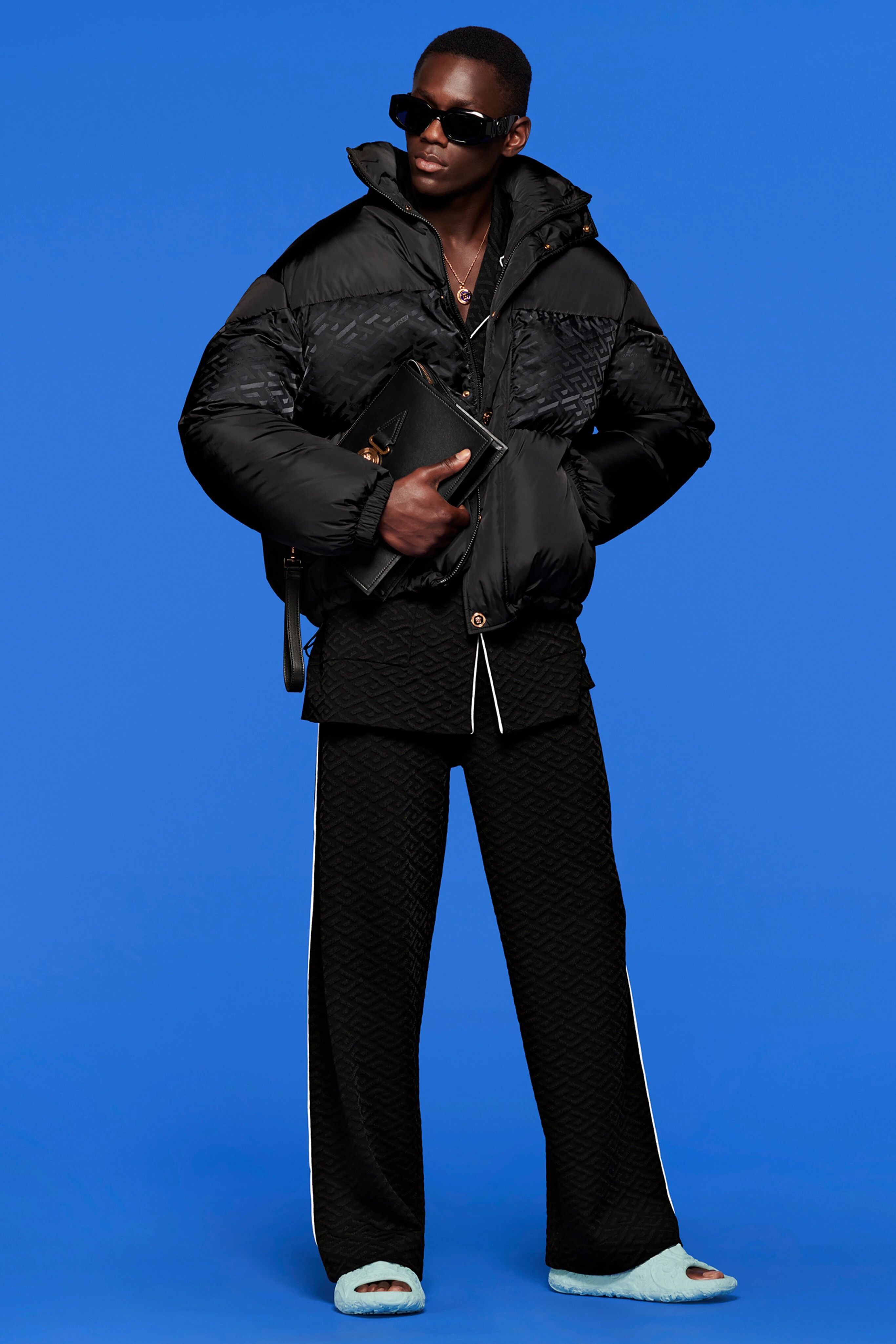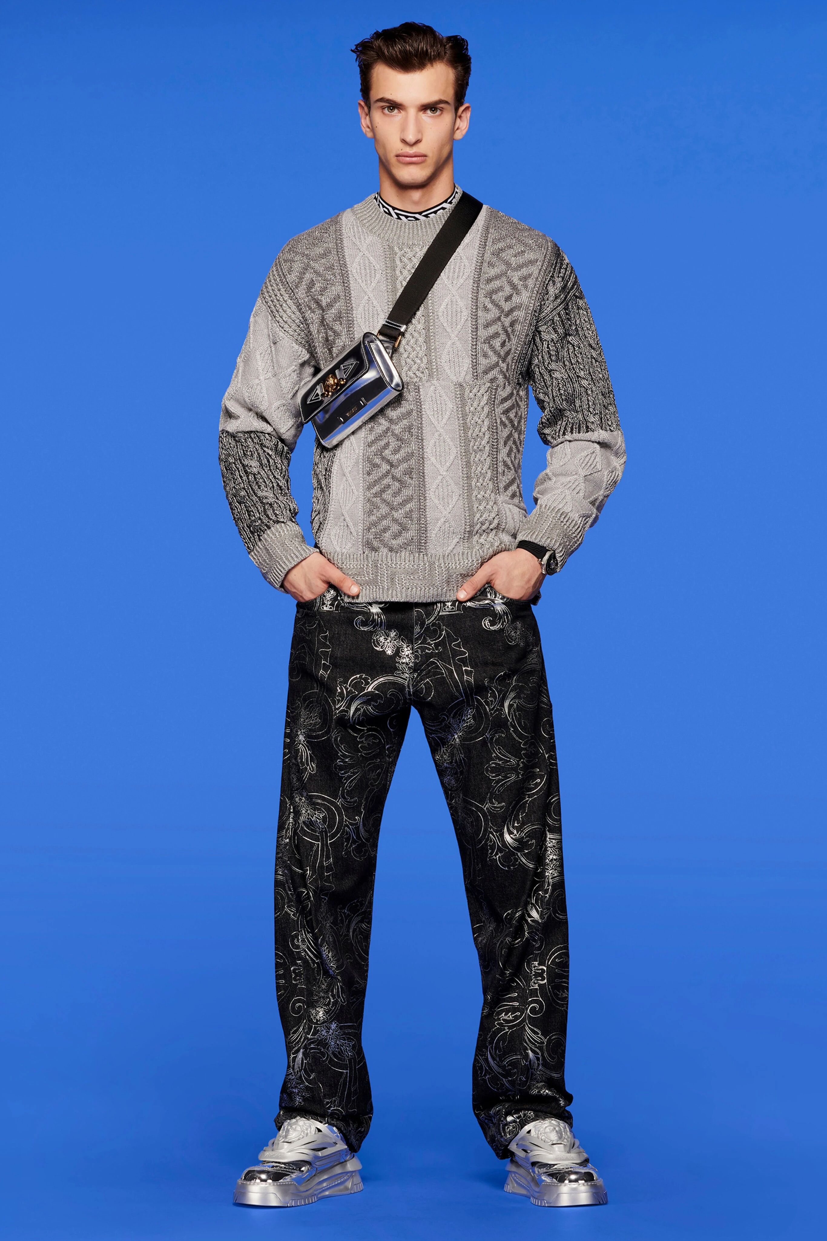 男装方面,纯粹的黑白色巴洛克风格图案充满先锋的视觉感受,覆盖于针织衫、衬衫、羽绒、运动装、牛仔服、西服套装等各类单品之上,形成统一的视觉符号;Donatella Versace 巧妙将鲜艳的粉蓝荧光色点缀其中,不显骚气,反而起到破除乏味的作用,可谓点到即止。