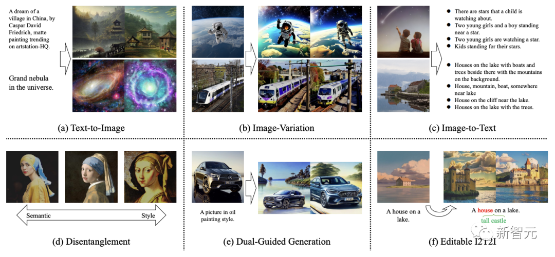 b) 支持新的扩展和应用,如图形风格和语义的分离、图像-文本双引导生成等。