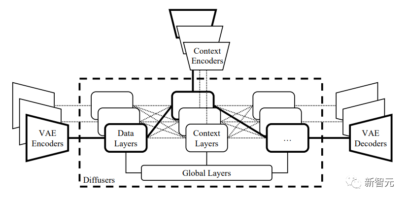 研究人员基于Versatile Diffusion,进一步提出了一个通用的多流多模态框架,其中包括VAE、上下文编码器和包含三层(即全局、数据和语境层)的diffuser。